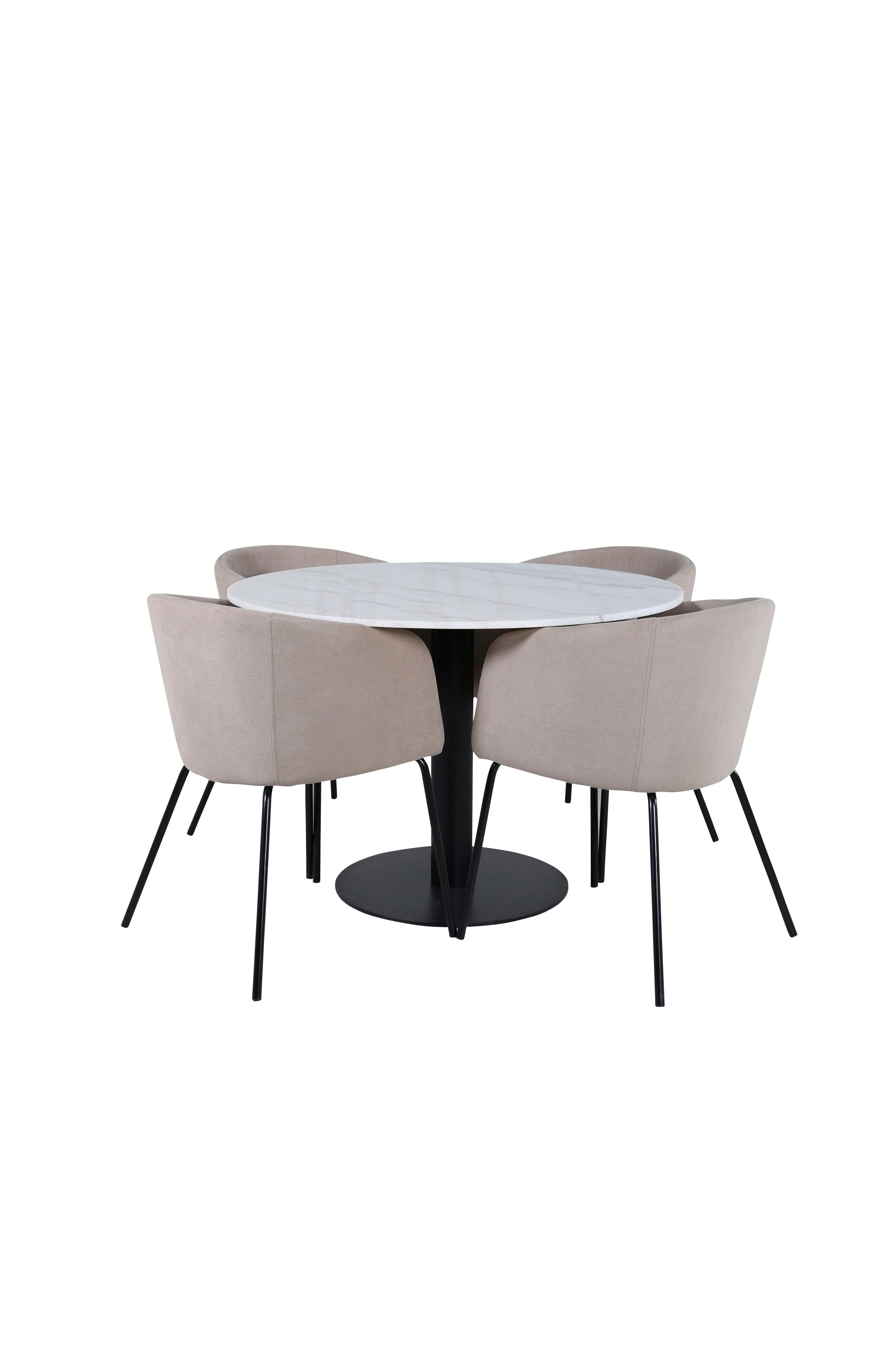 Estelle matbord med en bordstopp i marmor och bordsben i metall. Matchas med 4 st Berit matstolar med stolsits i polyester linne och stolsben i järn. Bord och stol kräver enklare montering. Bordets mått: Diameter: 106 cm, höjd: 75 cm. Stolens mått: Sittdjup: 45 cm, sittbredd: 55 cm, sitthöjd: 49 cm.