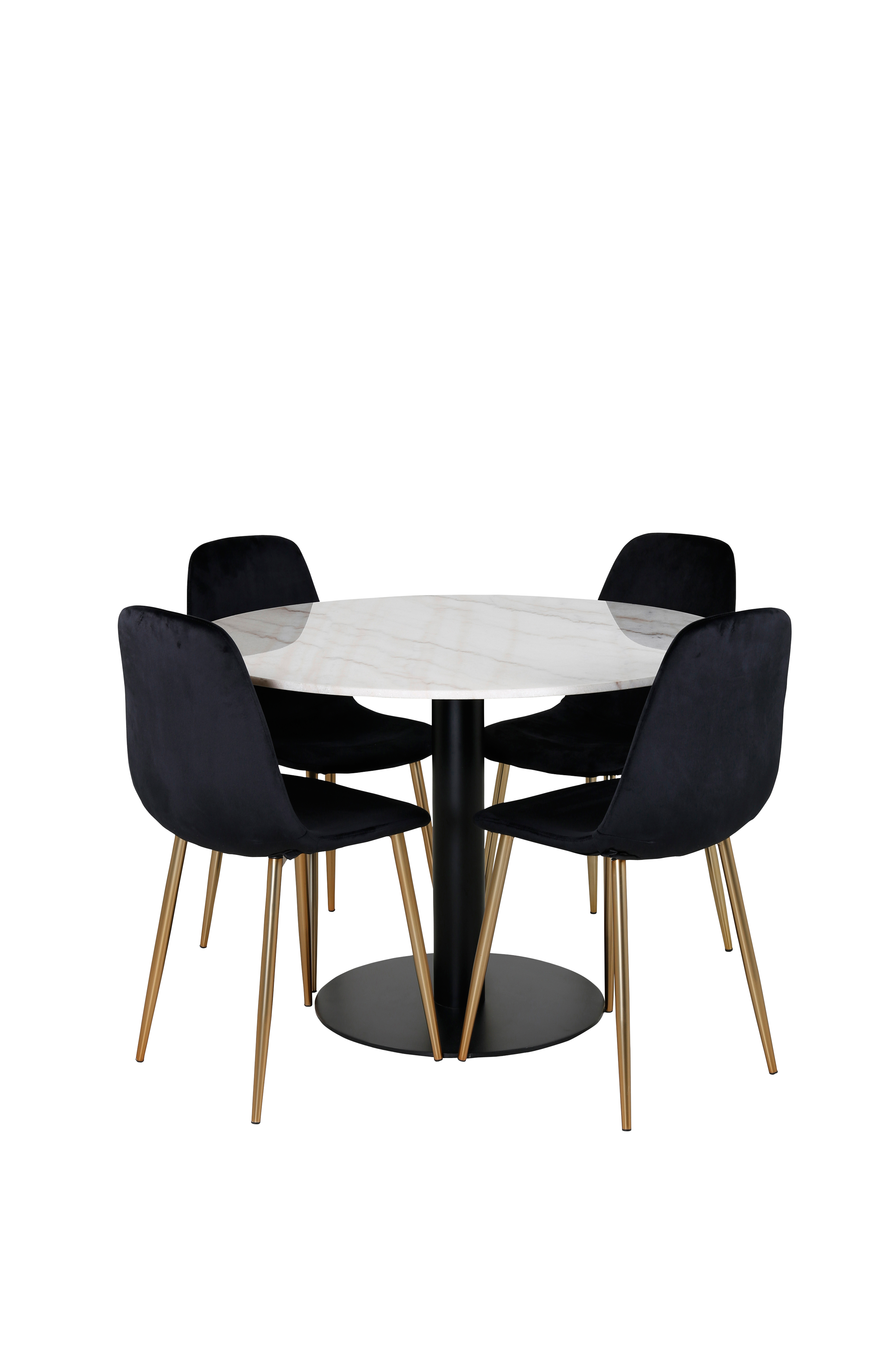 Estelle matbord med en rund bordstopp i marmor och bordsben i metall. Matchas med 4 st Polar matstolar med stolsits i sammet och stolsben i metall. Bord och stol kräver enklare montering. Bordets mått: Diameter: 106 cm, höjd: 75 cm. Stolens mått: Sittbredd: 44 cm, sittdjup: 39 cm, sitthöjd: 48 cm.