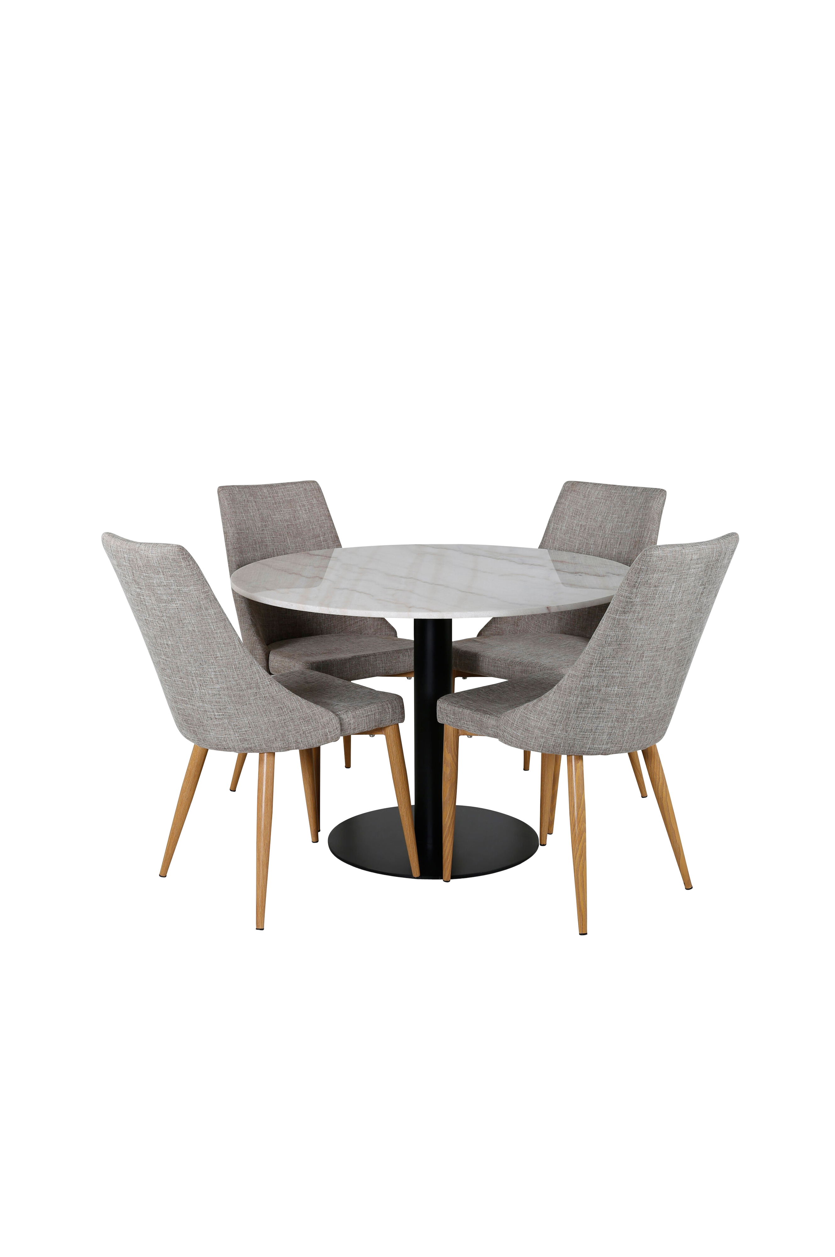 En matgrupp i modern och stilren design. Det runda matbord estelle är både elegant och praktiskt. Bordet har en blank bordsskiva i , spräcklig marmor och ett cylinderformat underrede i metall. Här i perfekt match med stolar från serien leone. Stolarna har en genomtänkt helklädd design som är enkel med ben i ek folierad metall och rygg/sits i polyestertyg med mjuk stoppning. Slipp kompromissa mellan komfort och blickfång!