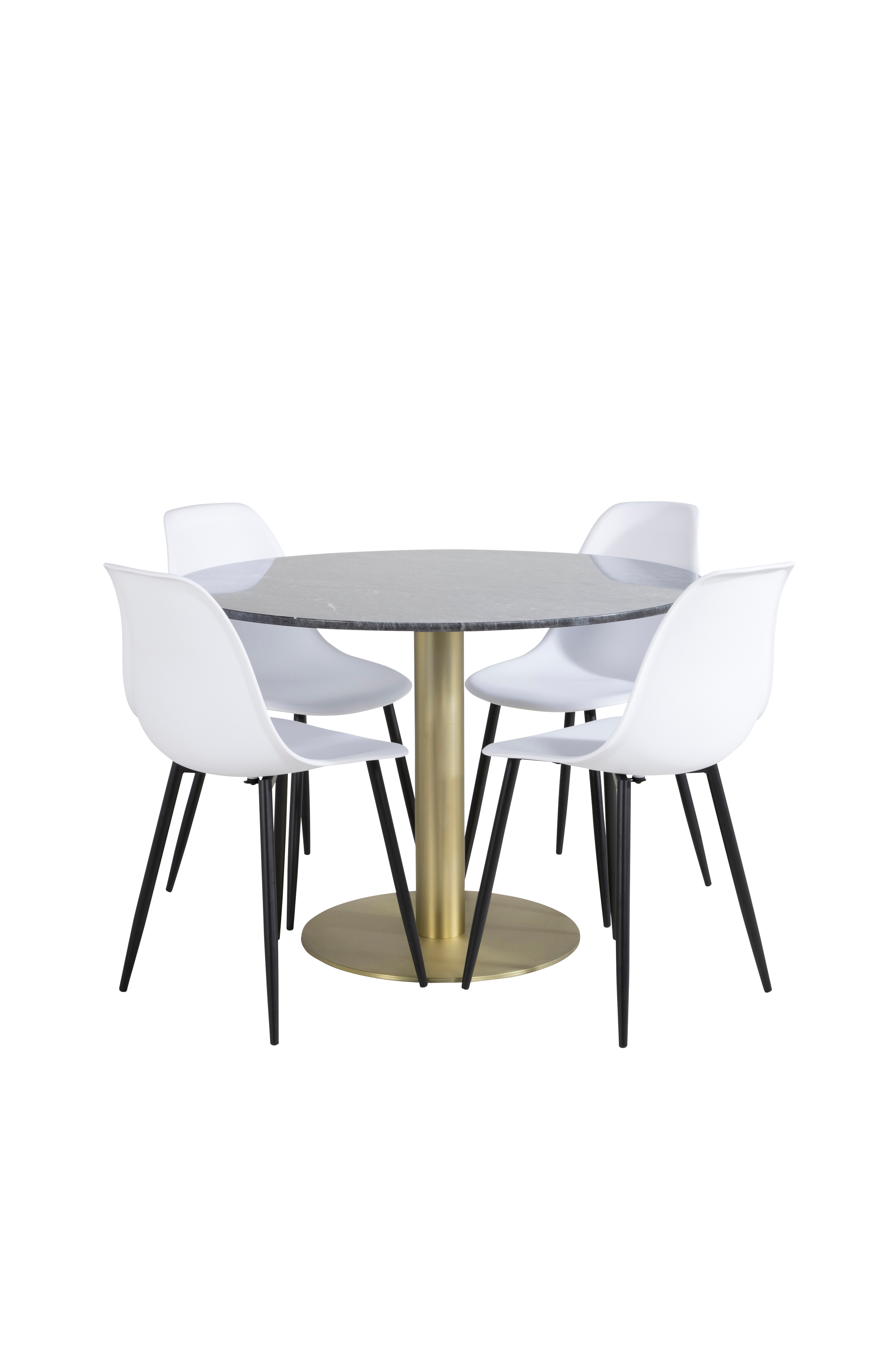Estri matbord med en rund topp i marmor och bordsben i metall . Matchas med 4st Penally klädda matstolar och stolsben i metall med snurrfunktion. Bord och stol kräver enklare montering. Bordets mått: Diameter: 106cm, Höjd: 75cm. Stolens mått: Sittdjup: 39cm, Sittbredd: 44cm, Sitthöjd: 48cm.