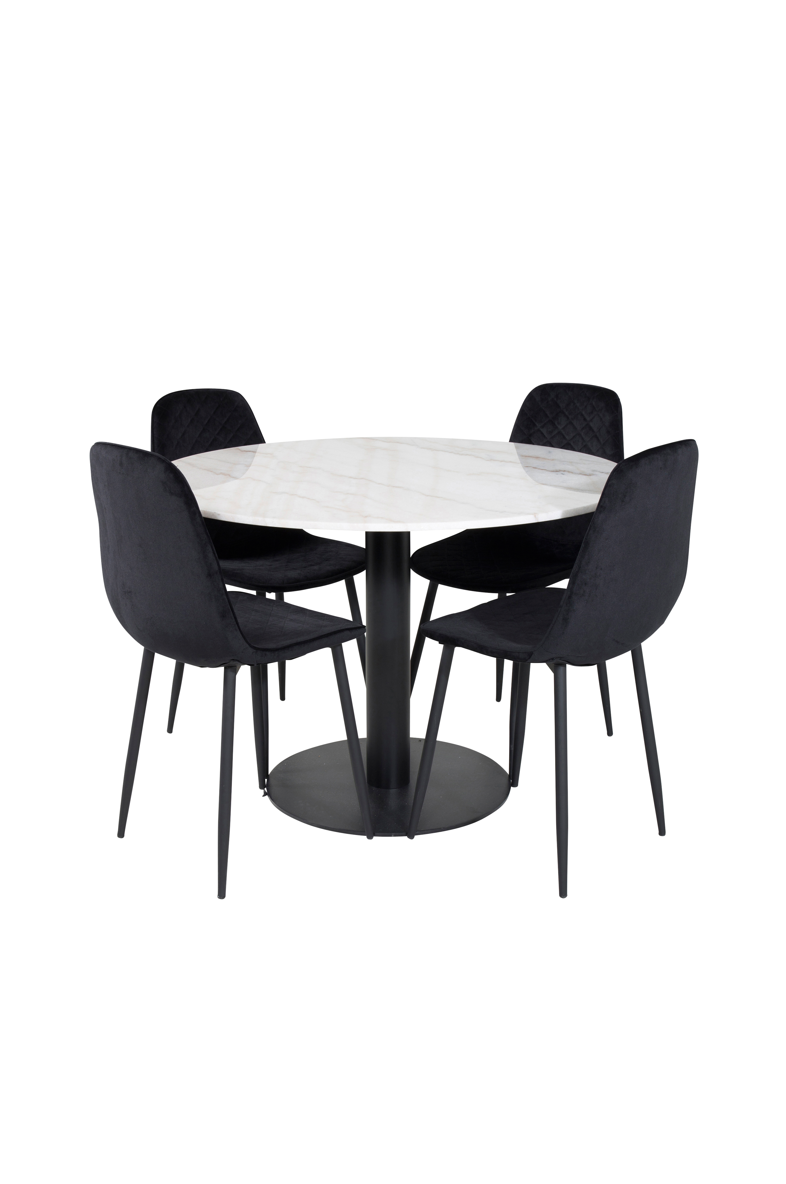 Estri matbord med en rund topp i marmor och bordsben i metall. Matchas med 4st Penally matstolar med stolsits i sammet med dekorsöm och stolsben i metall. Bord och stol kräver enklare montering. Bordets mått: Diameter: 106cm, Höjd: 75cm. Stolens mått: Sittdjup: 39cm, Sittbredd: 44cm, Sitthöjd: 48cm.