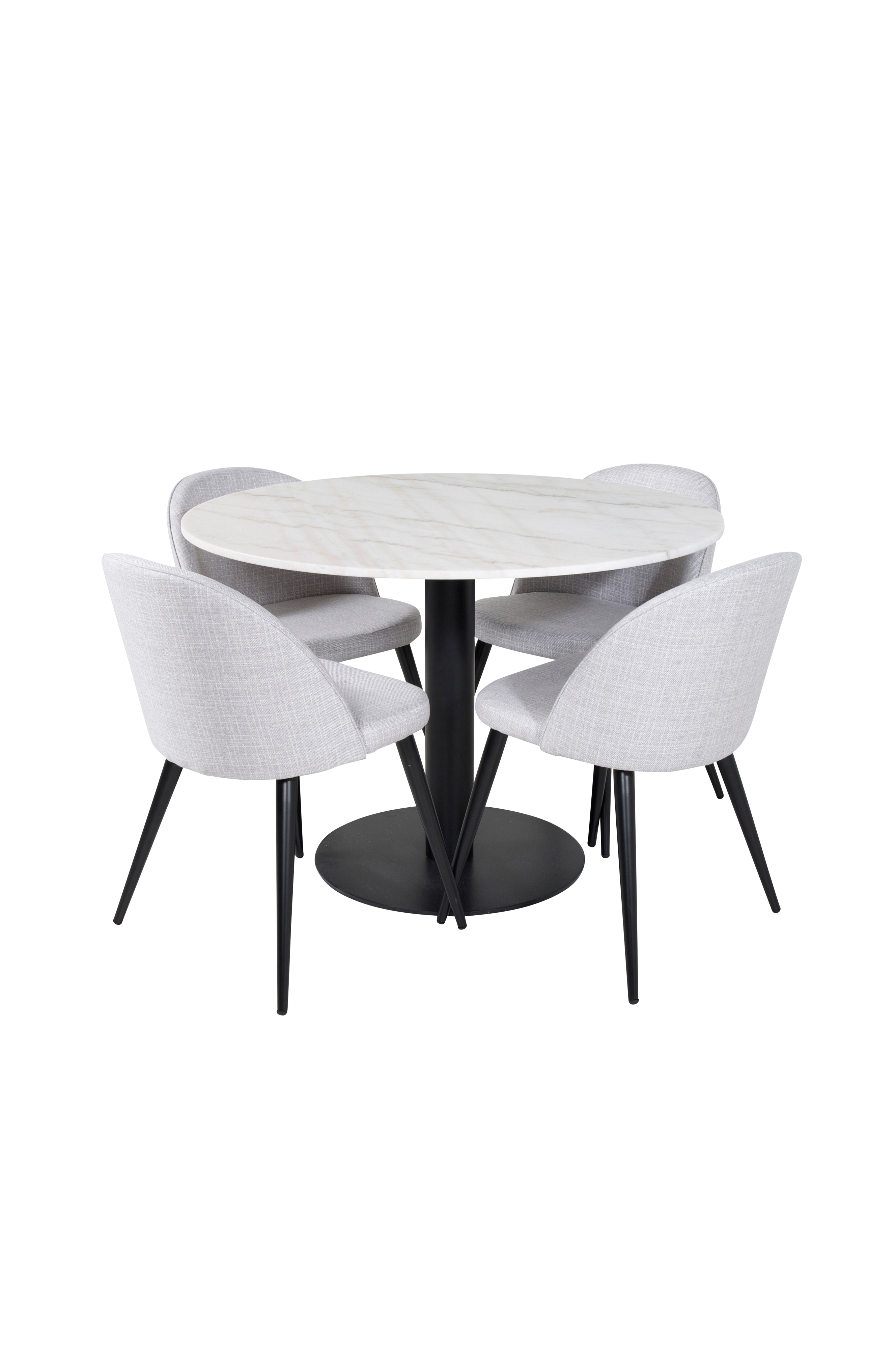 Estri matbord med en rund topp i marmor och bordsben i metall. Matchas med 4st Valleta matstolar med stolsits i polyester och stolsben i metall. Bord och stol kräver enklare montering. Bordets mått: Diameter: 106cm, Höjd: 75cm. Stolens mått: Sitthöjd: 46,5cm, Sittdjup: 42,5cm, Sittbredd: 41.
