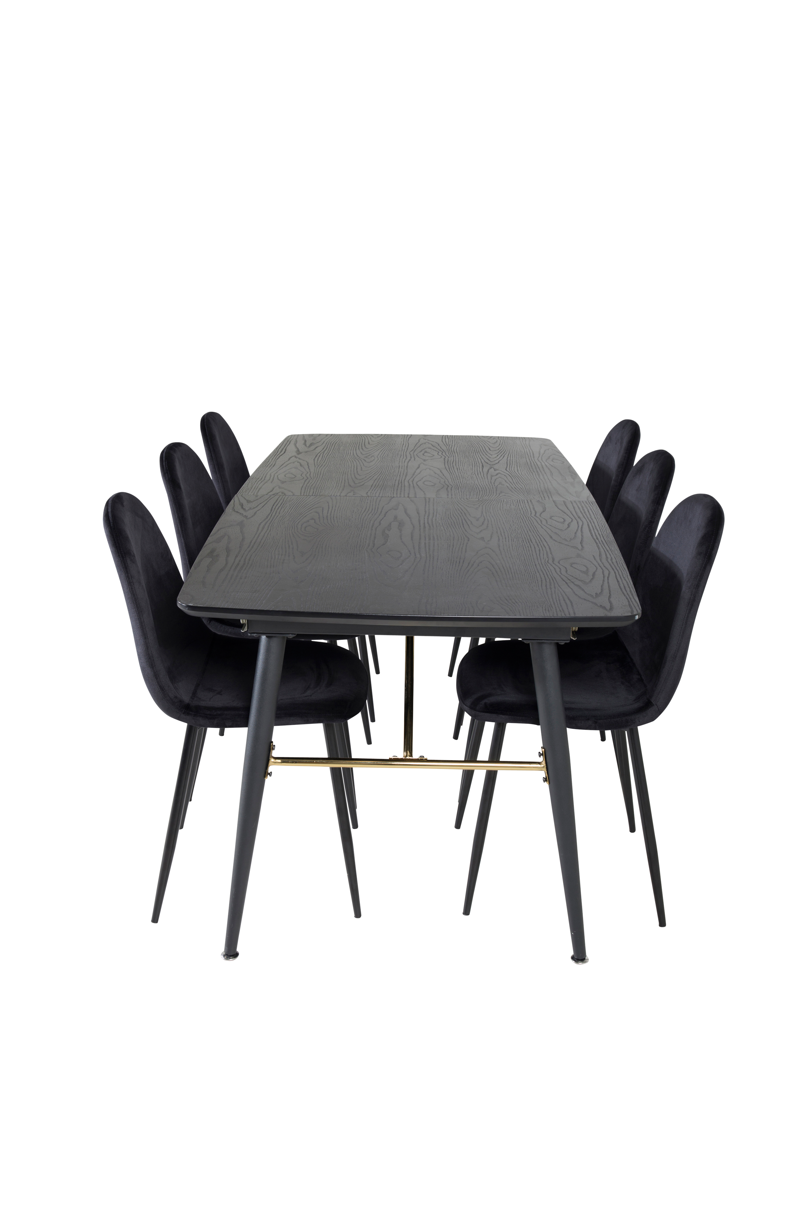 Gärdet förlängningsbart matbord med en topp i MDF och bordsben i metall. Bordet kan förlängas till 220 cm. Matchas med 6st Penally matstolar med stolsits i sammet och stolsben i metall. Bord och stol kräver enklare montering.