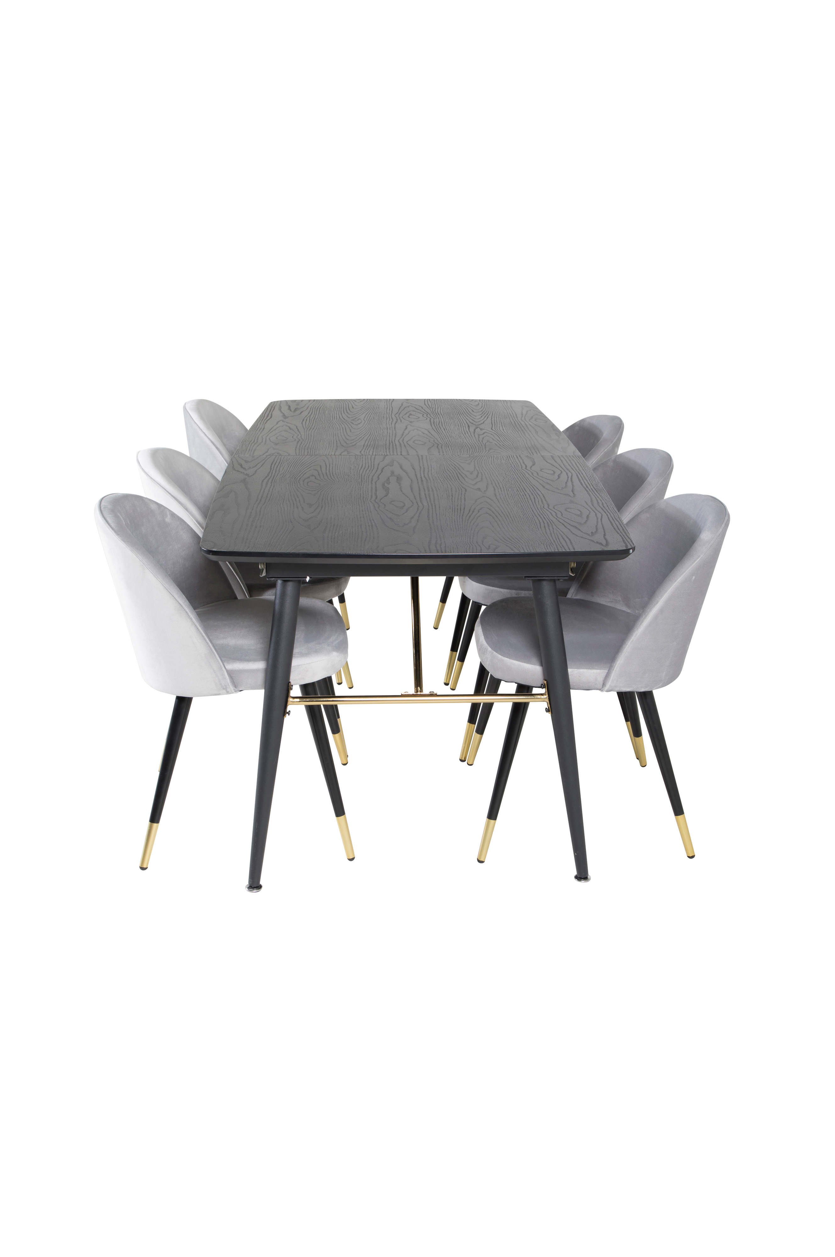 Gärdet matbord förlängningsbart upp till 220 med en bordstopp i MDF och bordsben i metall. Matchas med 6 st Valletta matstolar med stolsits i sammet och stolsben i metall. Bord och stol kräver enklare montering. Bordets mått: Längd: 180 cm, bredd: 85 cm, höjd: 76 cm. Stolens mått: Sittdjup: 42.5 cm, sittbredd: 41 cm, sitthöjd: 46.5 cm.