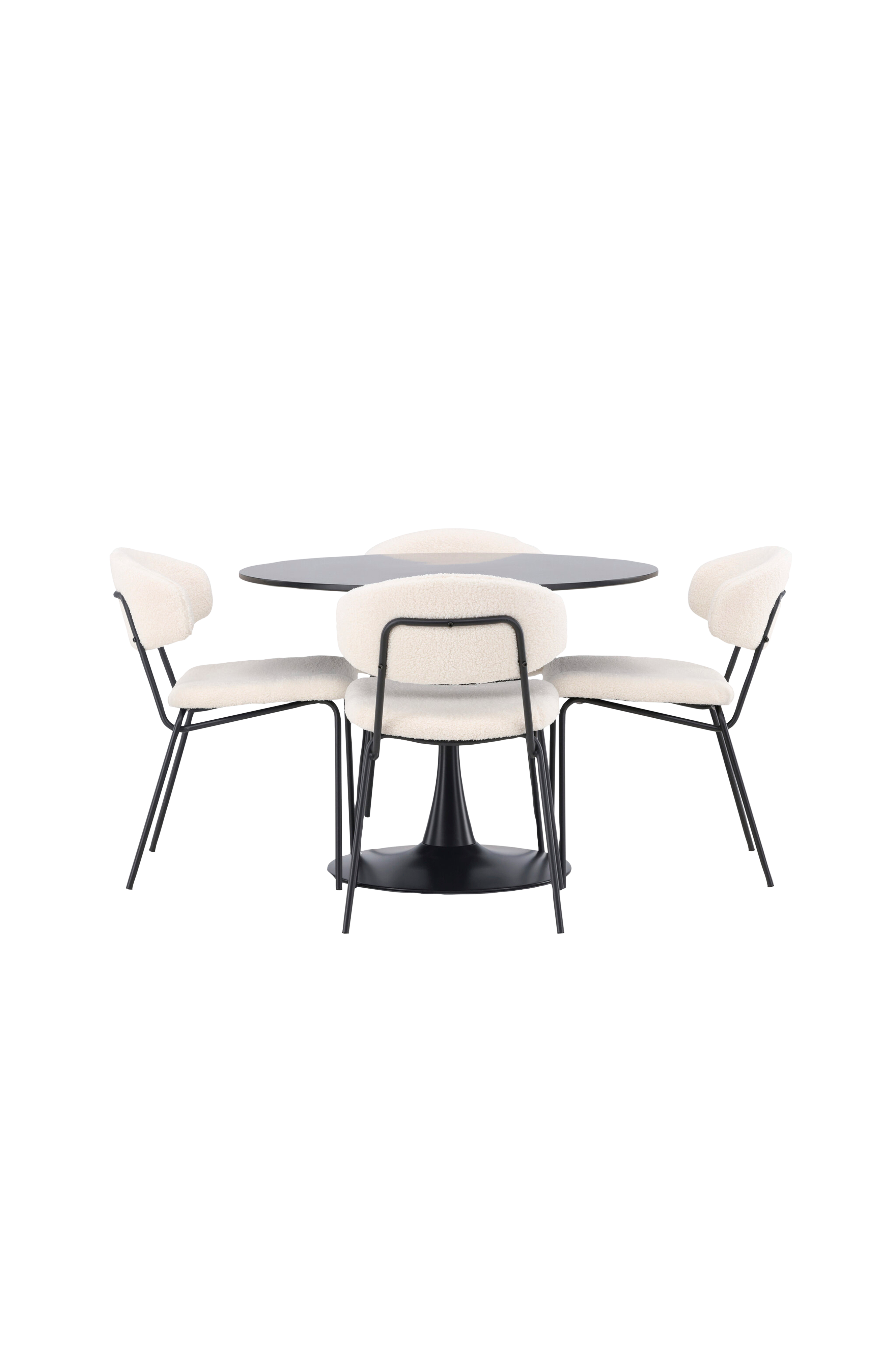 Modernt och minimalistisk design - helt i linje med trenderna! Matbord glade har en stilren skandinavisk design med en smäcker trumpetfot i stål och en bordsskiva i mdf. Här tillsammans med underbara matstolar från serien chico. Stolen är i boucletyg med en stoppad sits och ryggstöd för extra komfort. Benen är smala i stål som ger stolen en luftig känsla. Här får du ett charmigt blickfång till vardagsrummet! Bordets mått: 100cm.