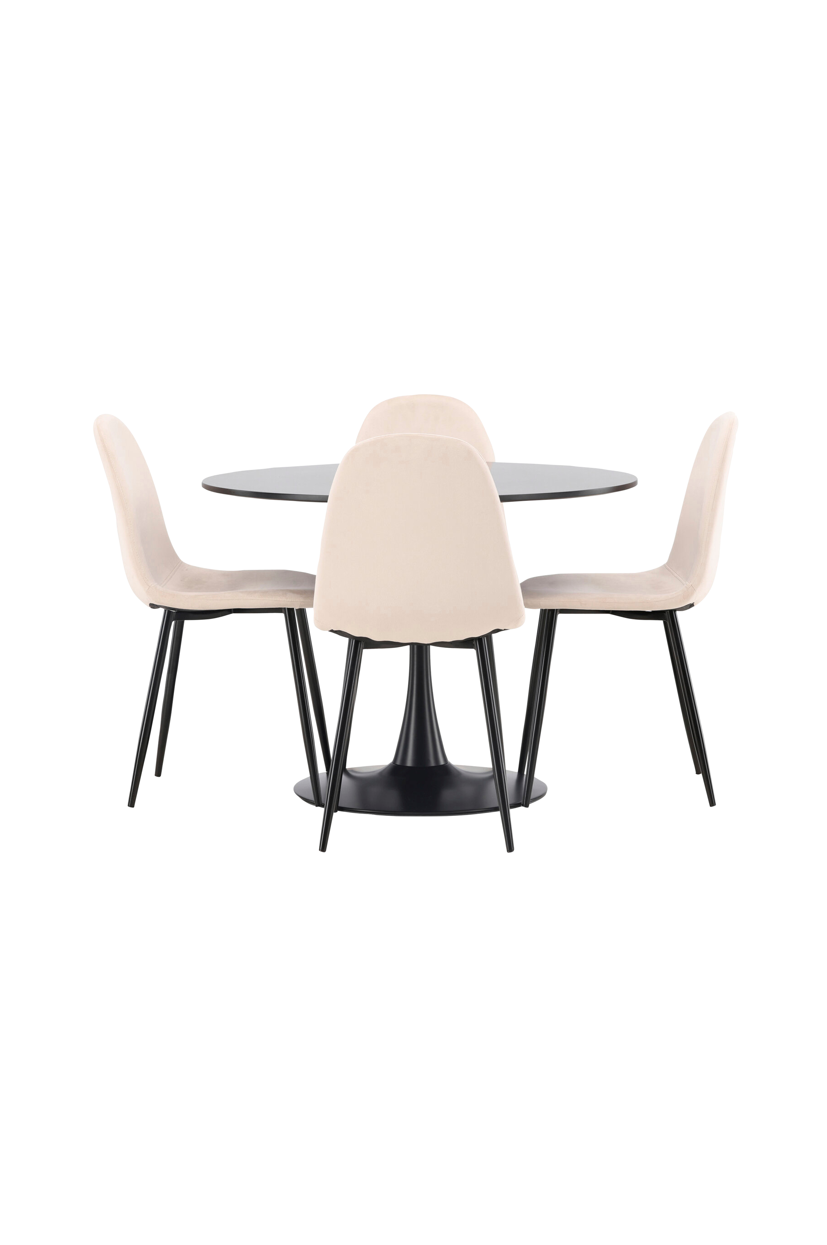 En matgrupp med elegant glans! Glade matbord har en stilren skandinavisk design med en smäcker trumpetfot i stål och en bordsskiva i mdf. Här i snygg kombination med venture designs matstolar från serien polar. Stolen har en helklädd design, ben i pulverlackerad metall samt rundad rygg och sits i sammetstyg med mjuk stoppning. Slipp kompromissa mellan komfort och design!