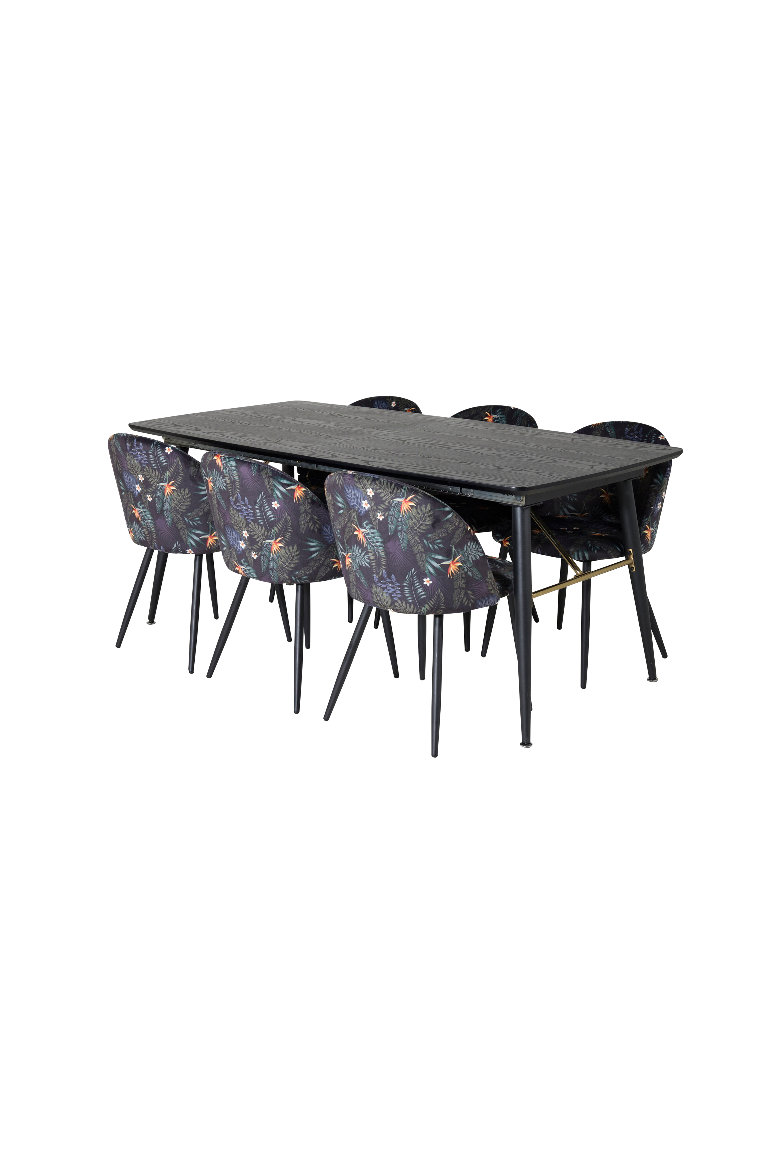 Pigga upp blickfånget i vardagsrummet med en matgrupp i smakfull design! Matbord gold är förlängningsbart och rymmer plats för alla nära och kära vid behov. Bordsskivan i stilfull kulör är tillverkadv mdf och har en diskret trä-look. Bordsbenen är modernt utsvängda i metall och skapar ett stadigt intryck. Här tillsammans med de omtyckta matstolarna velvet i en glädjefylld kulör. Stolen har en helklädd design med ben i pulverlackerad metall, rygg och sits med mjuk stoppning i sammetstyg. Våga sticka ut och sätt en personlig prägel på inredningen!