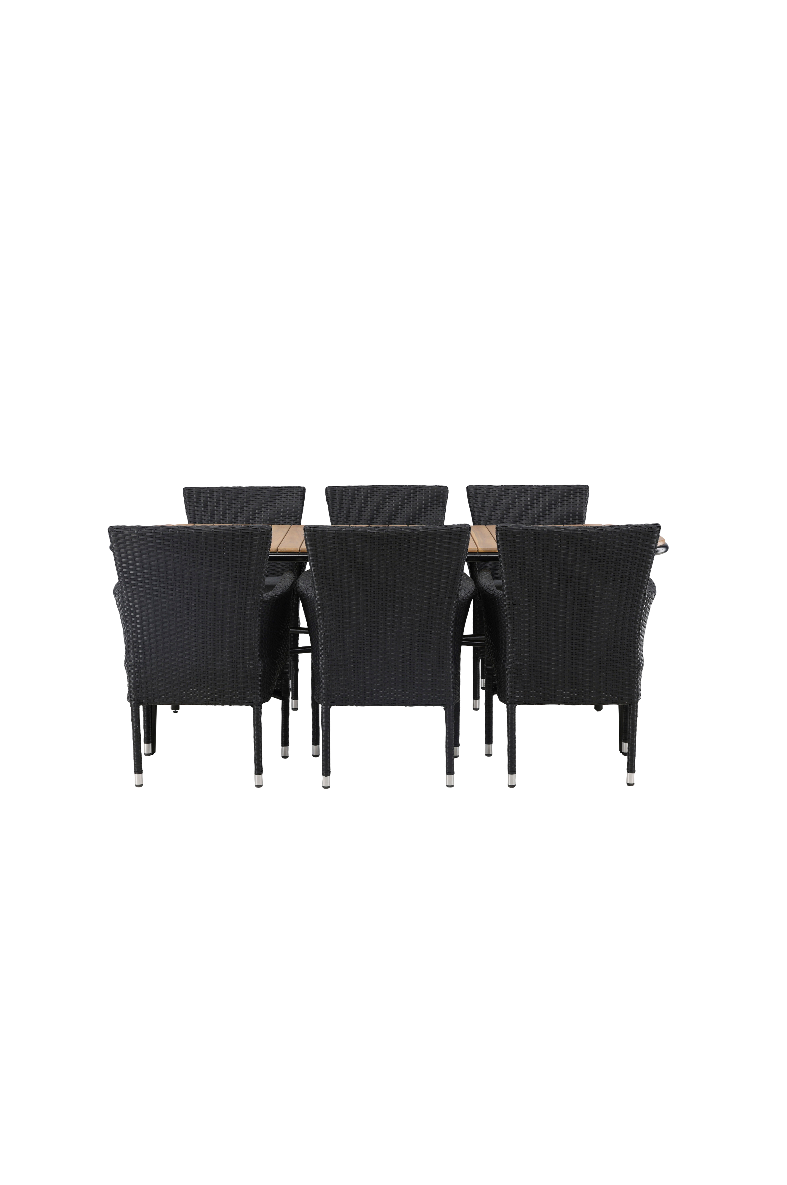 Med den här matgruppen välkomnas du hem till ett varmt och charmigt blickfång! Det populära matbordet holmbeck har en rektangulär bordskiva i elegant akacia med rundade kanter och ett minimalistiskt underrede i stål. Matstolarna tillhör serien malina och står sig garanterat över tid. Stolen har en stomme i aluminium och är klädd i korgflätad, konstrotting. Slipp kompromissa mellan stil och komfort i sommar!