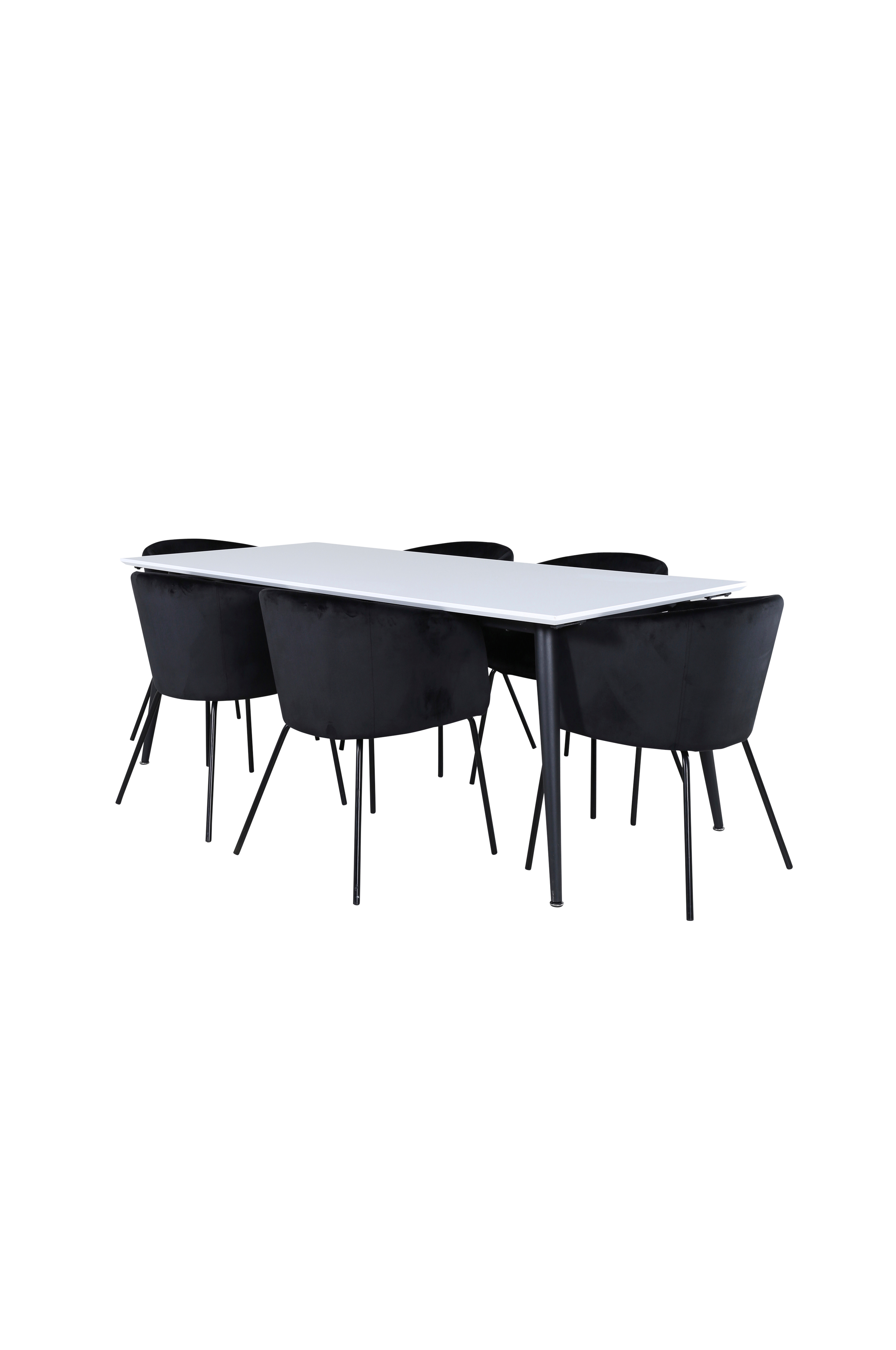 Jimmy matbord förlängningsbart upp till 285 cm med en bordstopp i HPL och MDF och bordsben i metall. Matchas med 6 st Berit matstolar med stolsits i sammet och stolsben i metall. Bord och stol kräver enklare montering. Bordets mått: Längd: 195 cm, bredd: 90 cm, höjd: 76 cm. Stolens mått: Sittdjup: 45 cm, sittbredd: 55 cm, sitthöjd: 49 cm.