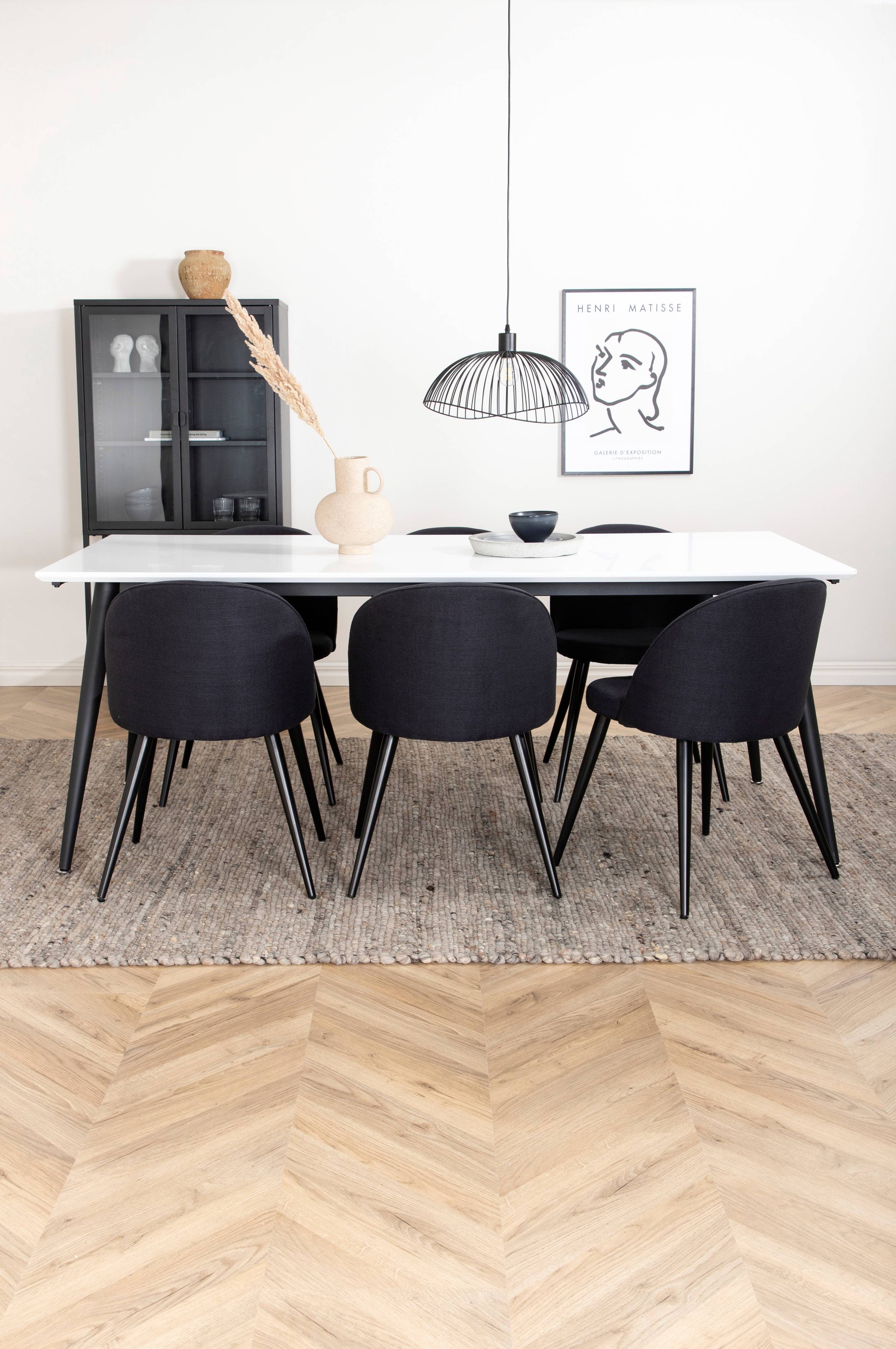 Jimmy matbord förlängningsbart upp till 285 cm med en bordstopp i HPL och MDF och bordsben i metall. Matchas med 6 st Velvet matstolar med stolsits i polyester och stolsben i metall. Bord och stol kräver enklare montering. Bordets mått: Längd: 195 cm, bredd: 90 cm, höjd: 76 cm. Stolens mått: Sittdjup: 42,5 cm, sittbredd: 41 cm, sitthöjd: 46,5 cm.