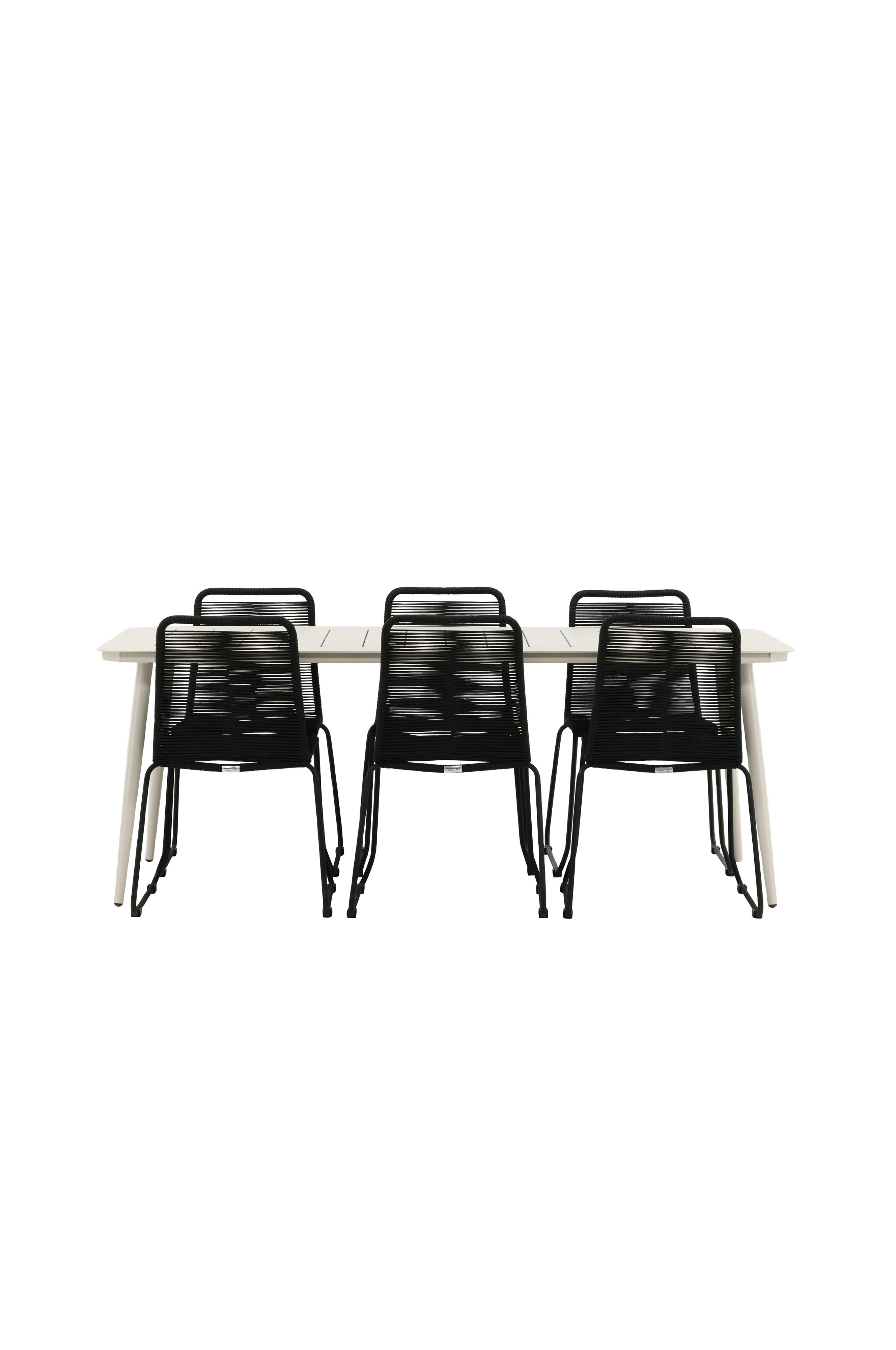 En modern kulör-matchning som skapar ett modemedvetet intryck i uterummet. Bordet Lina har en minimalistisk design i stål, med en rektangulär bordsskiva och mjukt rundade kanter. Bordsbenen är lätt utsvängda och ger ett stadigt intryck. Här tillsammans med a matstolar från serien Lindos. Stolarna har stilrent smala ben i stål och en sits i slitstarkt rep. Stolen är också stapelbar för praktisk förvaring. Bjud in till många trivsamma måltider framöver!