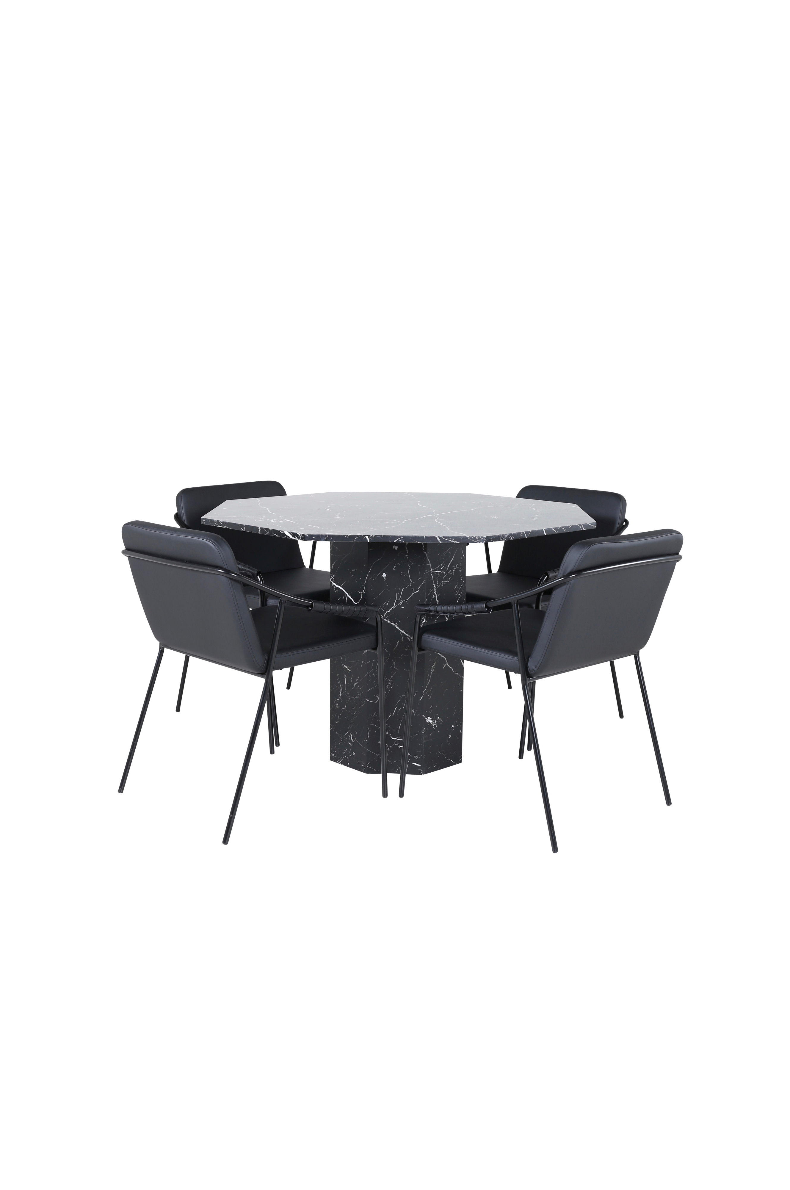 Marbs matbord med en rund bordstopp i MDF med marmor papper och bordsben i MDF med marmor papper. Matchas med 4 st Tvist matstolar med stolsits i konstläder och stolsben i järn. Bord och stol kräver enklare montering. Bordets mått: Diameter: 110 cm, höjd: 75 cm. Stolens mått: Sittdjup: 41 cm, sittbredd: 48 cm, sitthöjd: 48 cm.