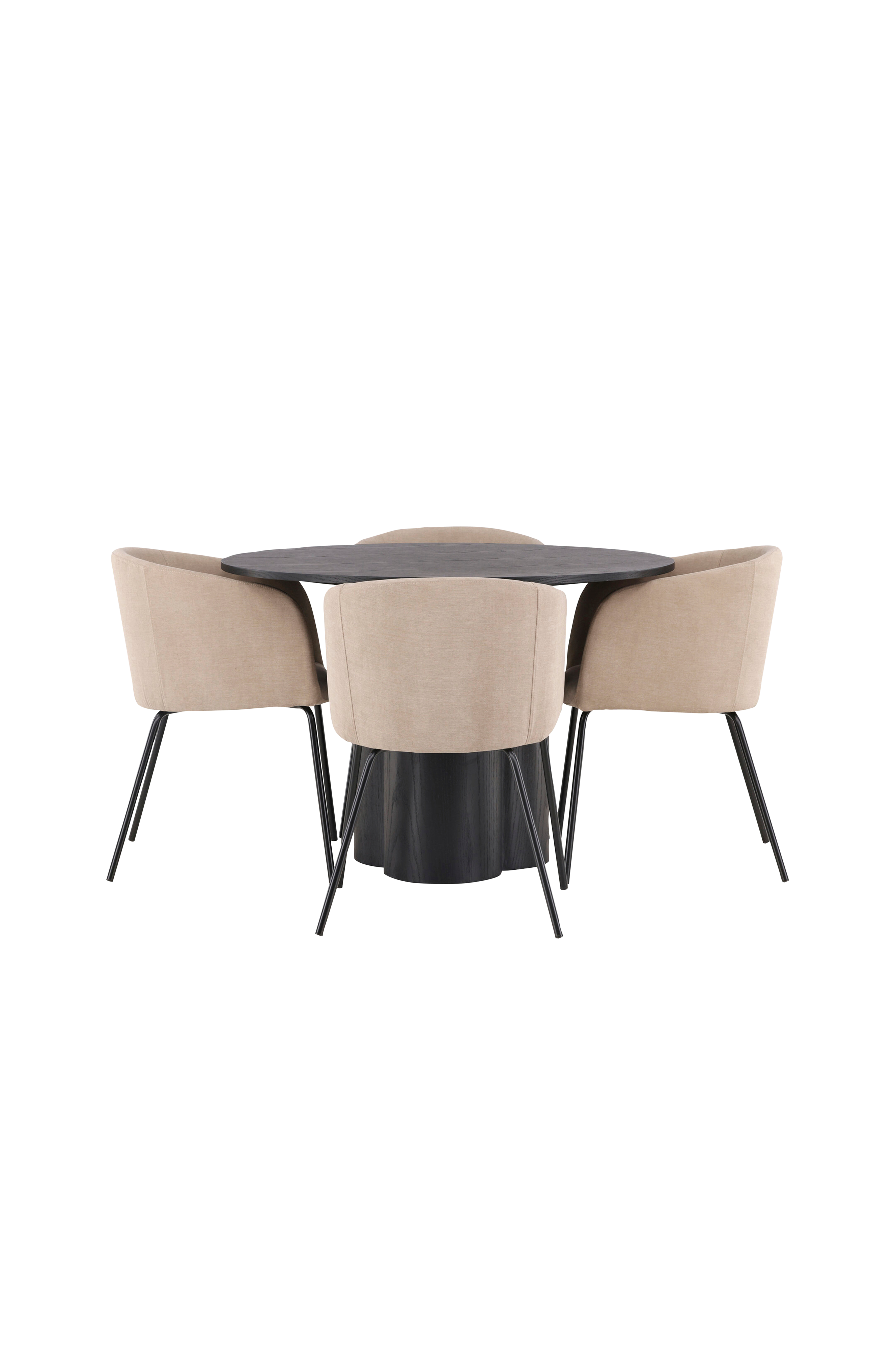 Sitt bekvämt och möblera lyxigt! Det runda matbordet olivia har en genomgående helhetsdesign i mdf med en tunn, rund toppskiva och tre cylinderformade ben som sitter samlat under bordets mitt. Här tillsammans med bekväma matstolar berit. Stolen har en helklädd design med lätt rundad rygg och sits i sammetstyg och polysterlinne samt smala stolsben i järn. Den här matgruppen utstrålar charm och elegans!