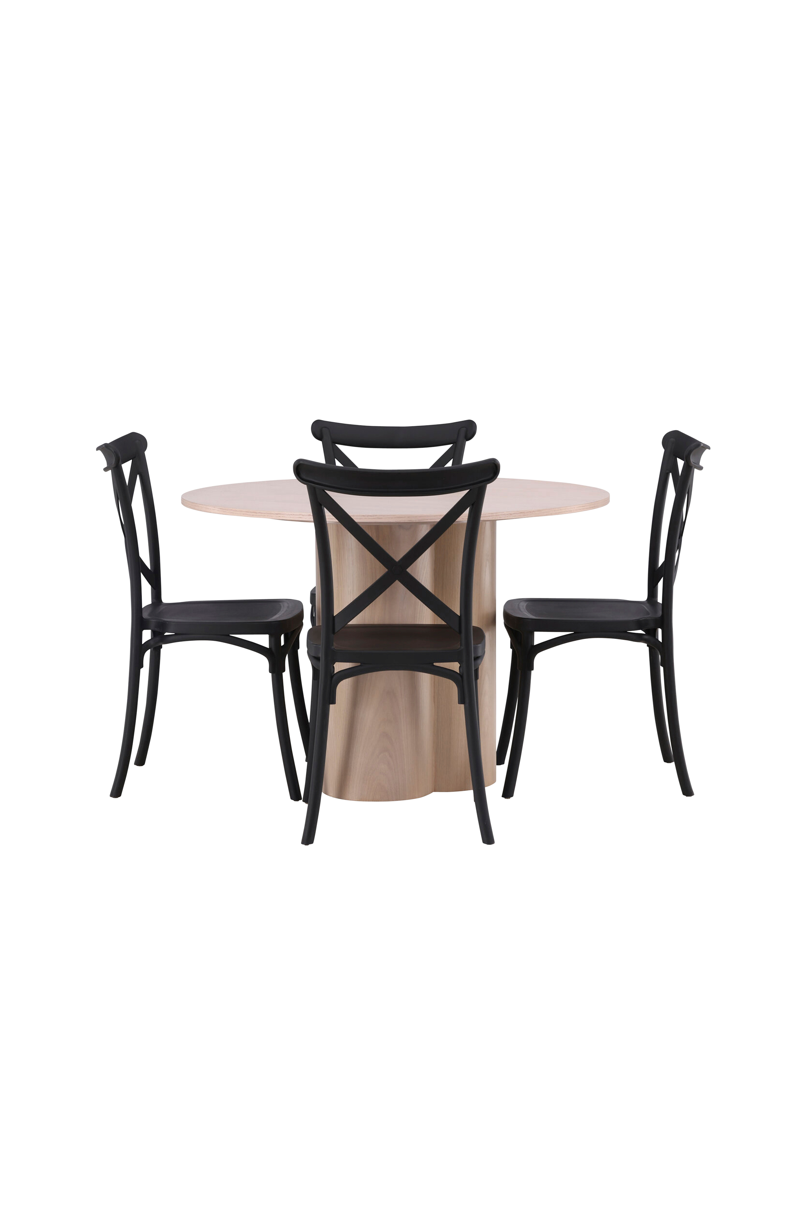 En pampig matgrupp som passar utmärkt i det moderna hemmet! Matbord olivia har en smakfull skandinavisk design och robust utformning. Bordet har en genomgående helhetsdesign i putsad mdf med en tunn, rund toppskiva och tre cylinderformade ben som sitter samlade under bordets mitt. Här tillsammans med 4st matstolar från serien crosett. Sitsen är genomgående tillverkad i det behändiga materialet plast och har en matt kulör som står sig över tid. Möblera hemmets hjärta inbjudande - här hamnar ingen på kanten!