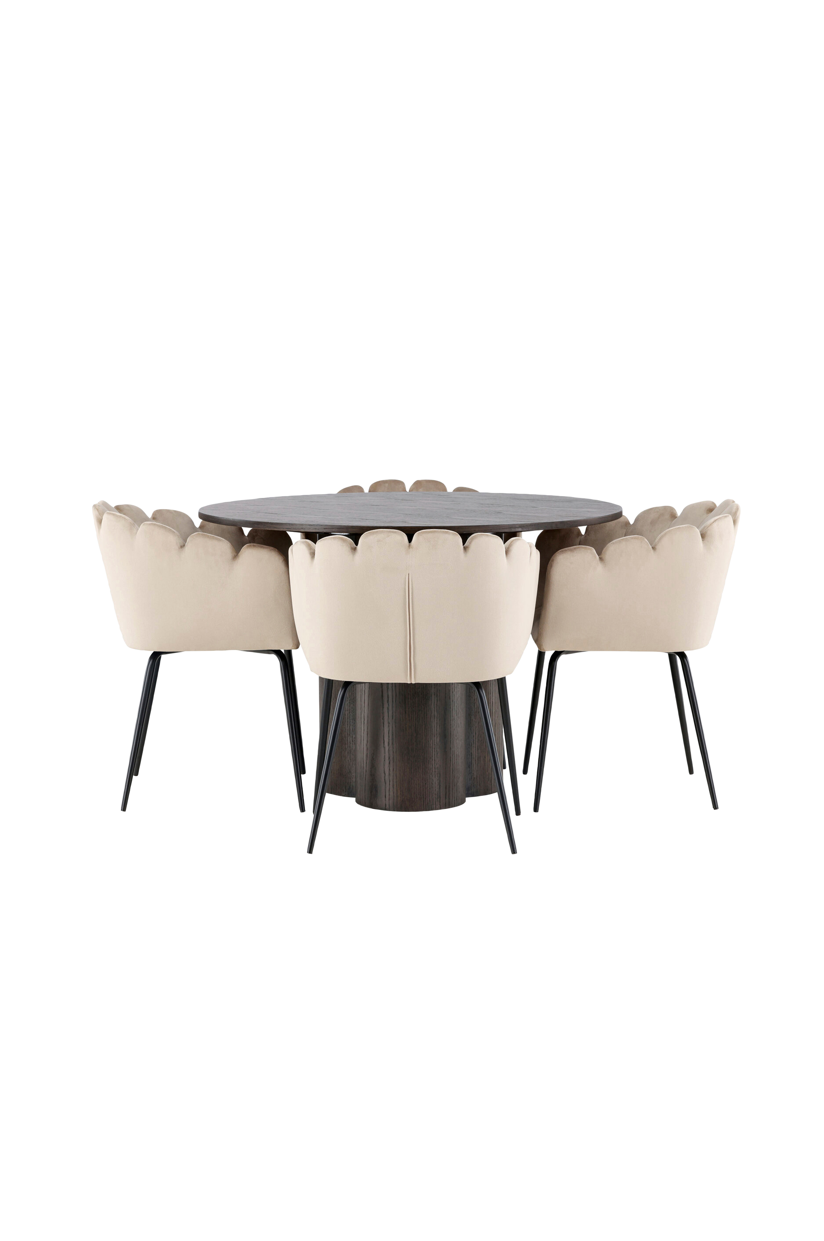 Jordnära kulörer och mjuka former - en charmig matgrupp för alla tillfällen! Det runda matbordet olivia har en skandinavisk helhetsdesign i modern -kulör. Bordet har en tunn bordsskiva i mdf och tre cylinderformade ben som sitter samlade under bordets mitt. Kulören har en lätt täcknad vilket synliggör materialets mönster. Här tillsammans med omtyckta matstolar limhamn. Stolen har en inbjudande design med dekorativ snäckformad rygg med dekorsömmar och en rund sits i smakfullt sammetstyg. Benen är i pulverlackerad metall. Bordets mått: 110cm.