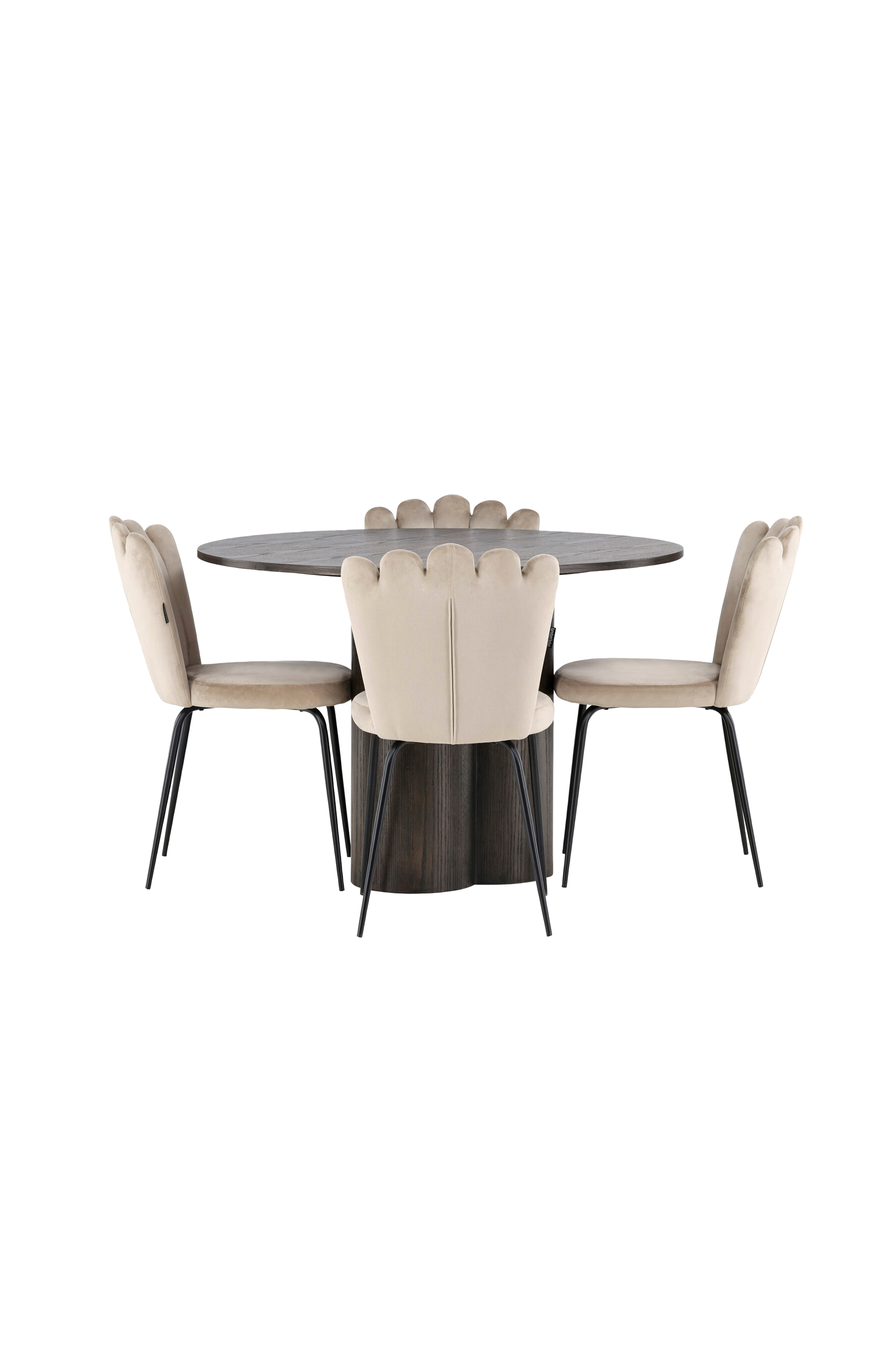 En matgrupp med lyster och charm! Det runda matbordet olivia har en skandinavisk helhetsdesign i modern -kulör. Bordet har en tunn bordsskiva i mdf och tre cylinderformade ben som sitter samlade under bordets mitt. Kulören har en lätt täcknad vilket synliggör materialets mönster. Här i modern kombination med matstolar från serien limhamn. Stolen har en inbjudande design med dekorativ snäckformad rygg med dekorsömmar och en rund sits i smakfullt sammetstyg. Benen är i pulverlackerad metall. Här hamnar ingen på kanten! Bordets mått: 110cm.