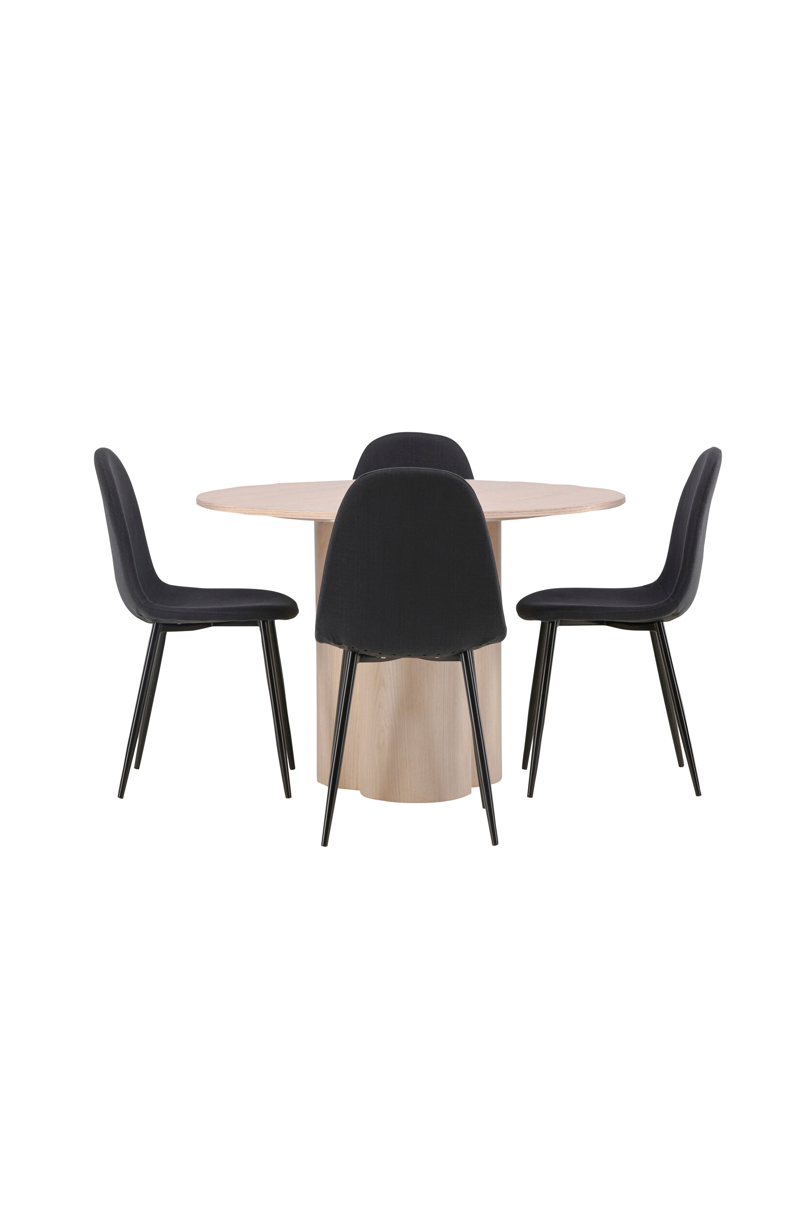 En stilren matgrupp som bjuder in till sociala stunder med nära och kära! Matbord olivia har en smakfull skandinavisk design och robust utformning. Bordet har en genomgående helhetsdesign i putsad mdf med en tunn, rund toppskiva och tre cylinderformade ben som sitter samlade under bordets mitt. Här tillsammans med 4st matstolar från serien polar. Stolsryggen är helklädd i stoppat polyestertyg och benen är i pulverlackerad metall. Skapa ett stilrent blickfång i hemmets hjärta - här hamnar ingen på kanten!