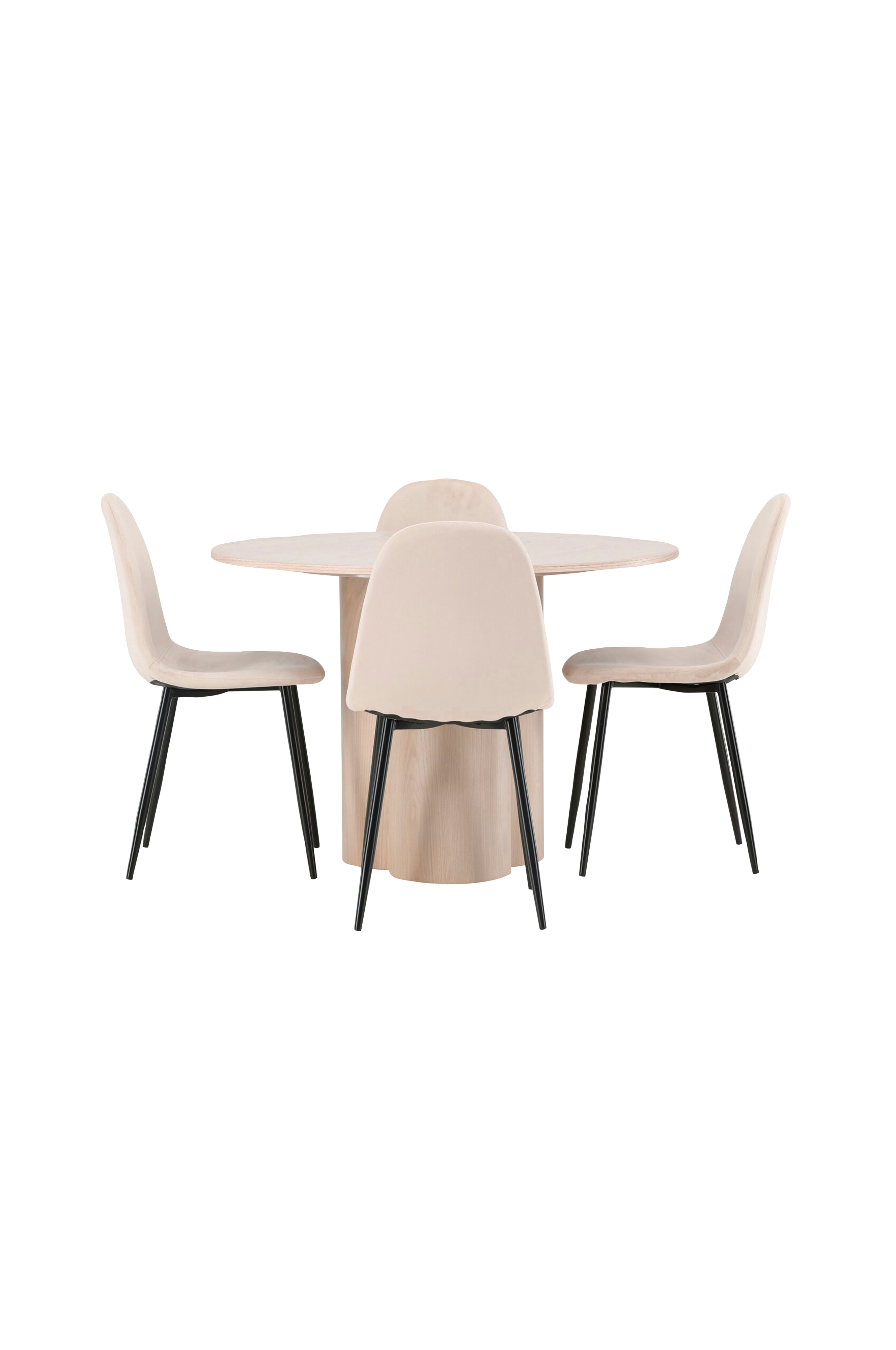 En stilren matgrupp som bjuder in till sociala stunder med nära och kära! Matbord olivia har en smakfull skandinavisk design och robust utformning. Bordet har en genomgående helhetsdesign i putsad mdf med en tunn, rund toppskiva och tre cylinderformade ben som sitter samlade under bordets mitt. Här tillsammans med 4st matstolar från serien polar. Stolsryggen är helklädd i stoppat sammetstyg och benen är i pulverlackerad metall. Skapa ett stilrent blickfång i hemmets hjärta - här hamnar ingen på kanten!