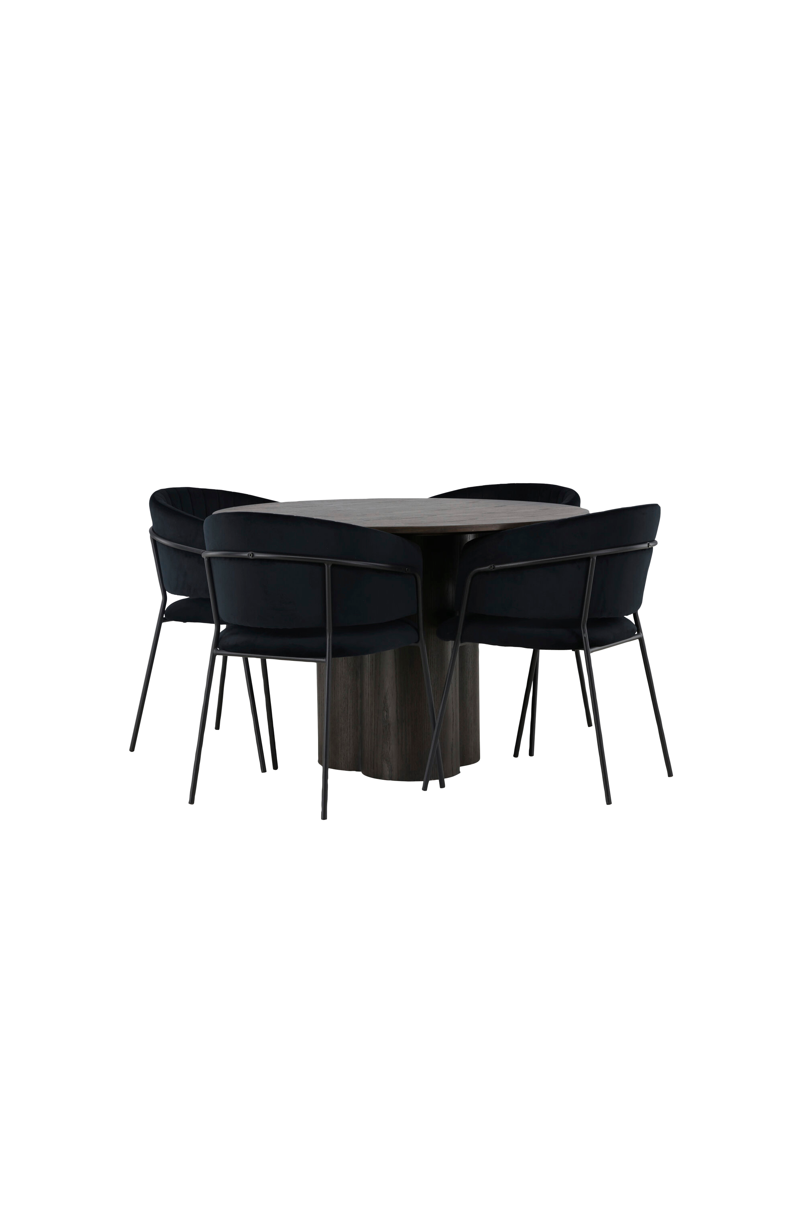här matchas matbordet med stilrena matstolar från serien selma för att fullända din upplevelse av komfort och stil. Dessa stolar har en omslutande design med en lätt rundad rygg och en mjuk sits klädd i sammetstyg. De dekorativa sömmarna tillför en touch av lyx och stolsbenen i stål är inte bara eleganta, de ger också stadga och stabilitet.
