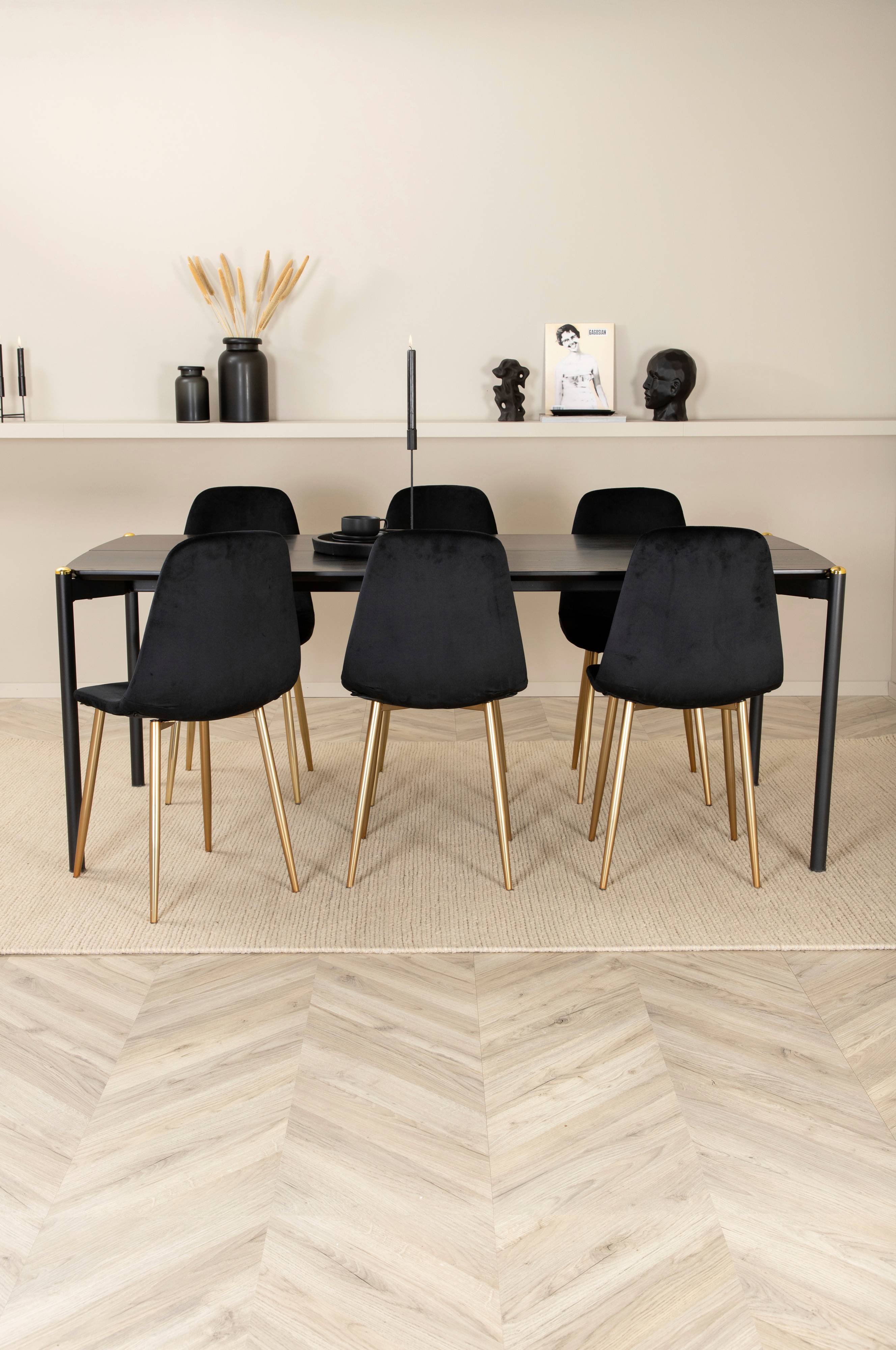 Pelle matbord med en bordstopp i MDF med faner och bordsben i metall. Matchas med 6 st Polar matstolar med stolsits i sammet och stolsben i metall. Bord och stol kräver enklare montering. Bordets mått: Längd: 190 cm, bredd: 90 cm, höjd: 75 cm. Stolens mått: Sittdjup: 39 cm, sittbredd: 44 cm, sitthöjd: 48 cm.