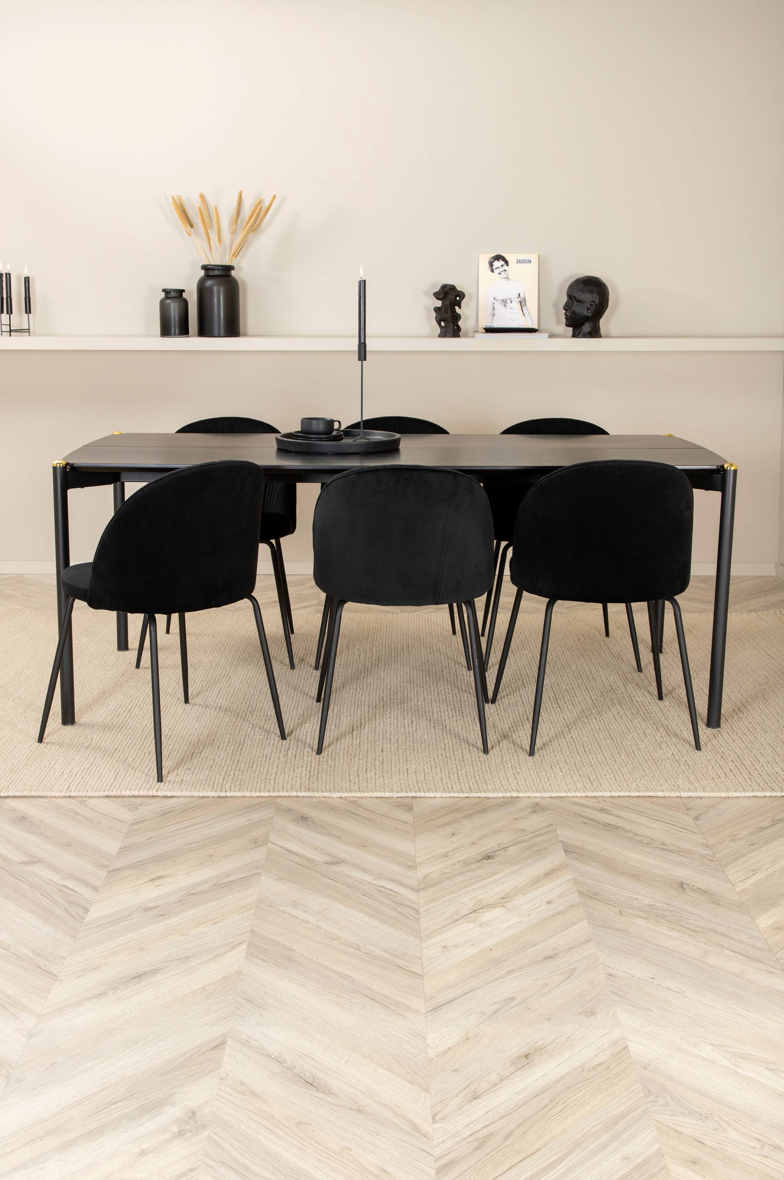 Pelle matbord med en bordstopp i MDF med faner och bordsben i metall. Matchas med 6 st Wrinkles matstolar med stolsits i sammet och stolsben i metall. Bord och stol kräver enklare montering. Bordets mått: Längd: 190 cm, bredd: 90 cm, höjd: 75 cm. Stolens mått: Sittdjup: 42 cm, sittbredd: 47 cm, sitthöjd: 49,5 cm.