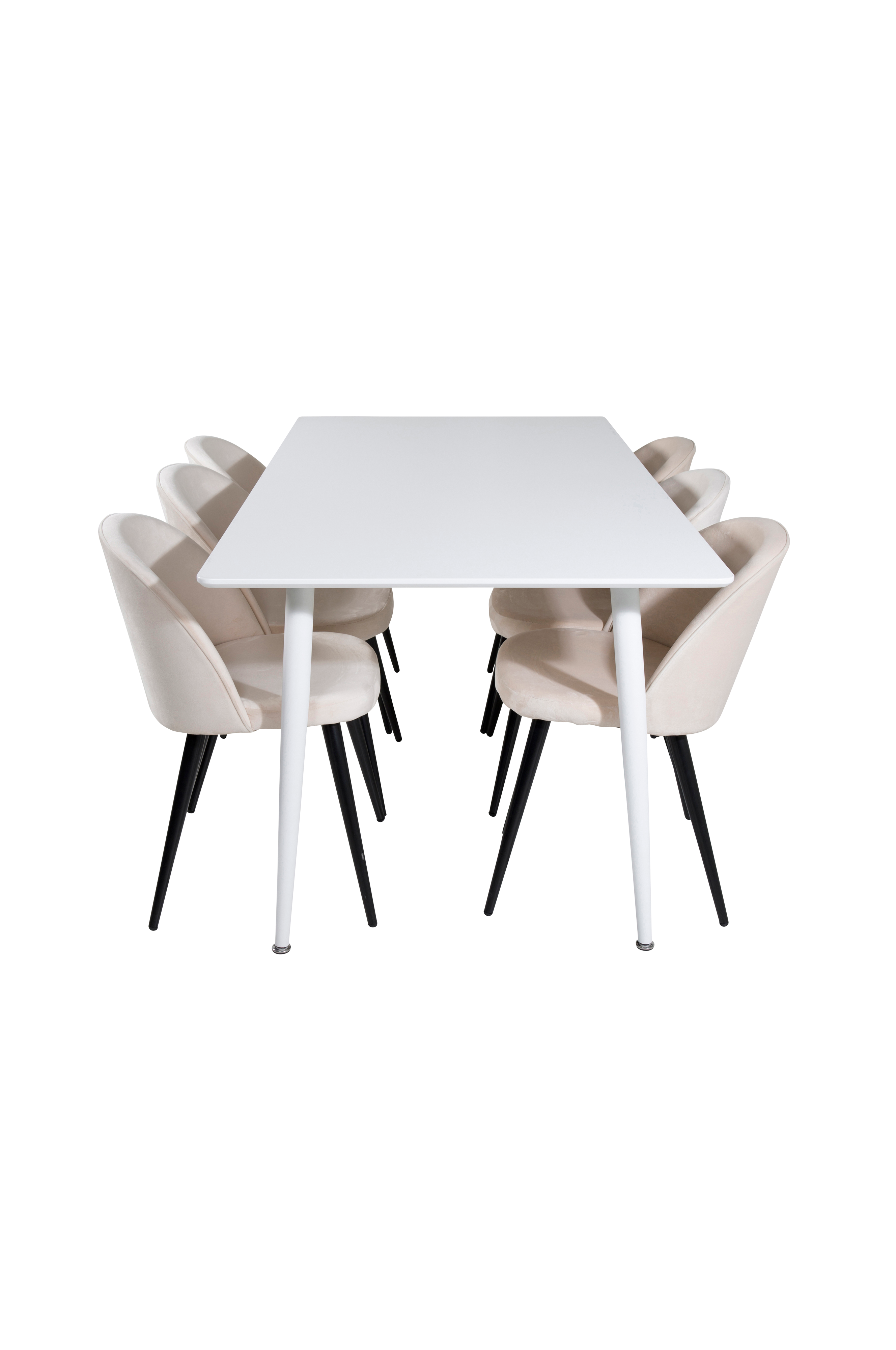 Penally matbord med en topp i MDF och bordsben i metall. Matchas med 6st Valleta matstolar med stolsits i sammet och stolsben i metall. Bord och stol kräver enklare montering. Bordets mått: Längd: 180cm, Bredd: 90cm, Höjd: 75cm. Stolens mått: Sittdjup: 42,5cm, Sittbredd: 41cm, Sitthöjd: 46,5cm.