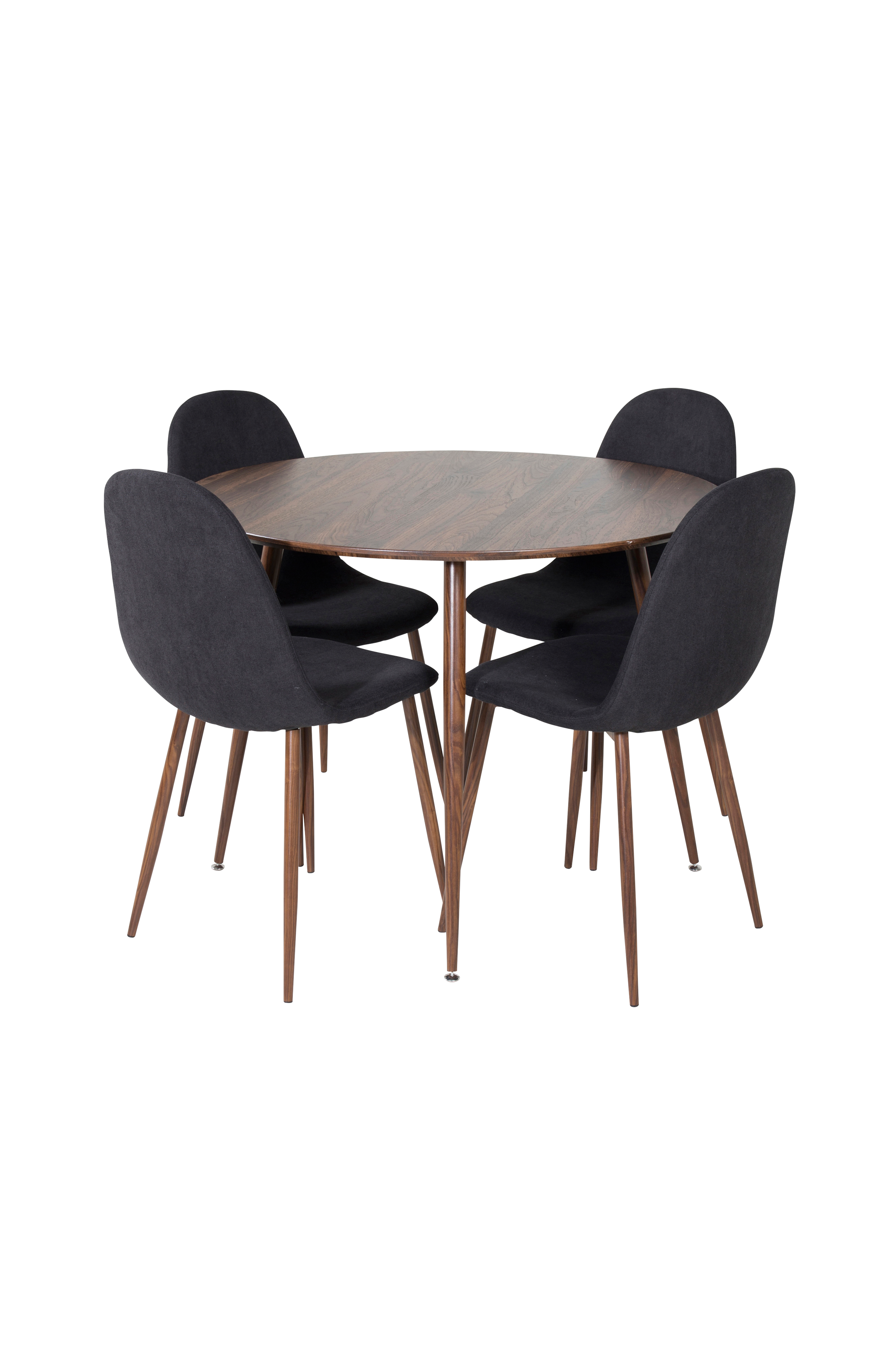 Pia matbord med en rund topp i MDF med valnötsfolering och bordsben i metall med valnötsfolering. Matchas med 4st Penally matstolar med stolsits i polyester och stolsben i metall med valnötsfolering. Bord och stol kräver enklare montering.