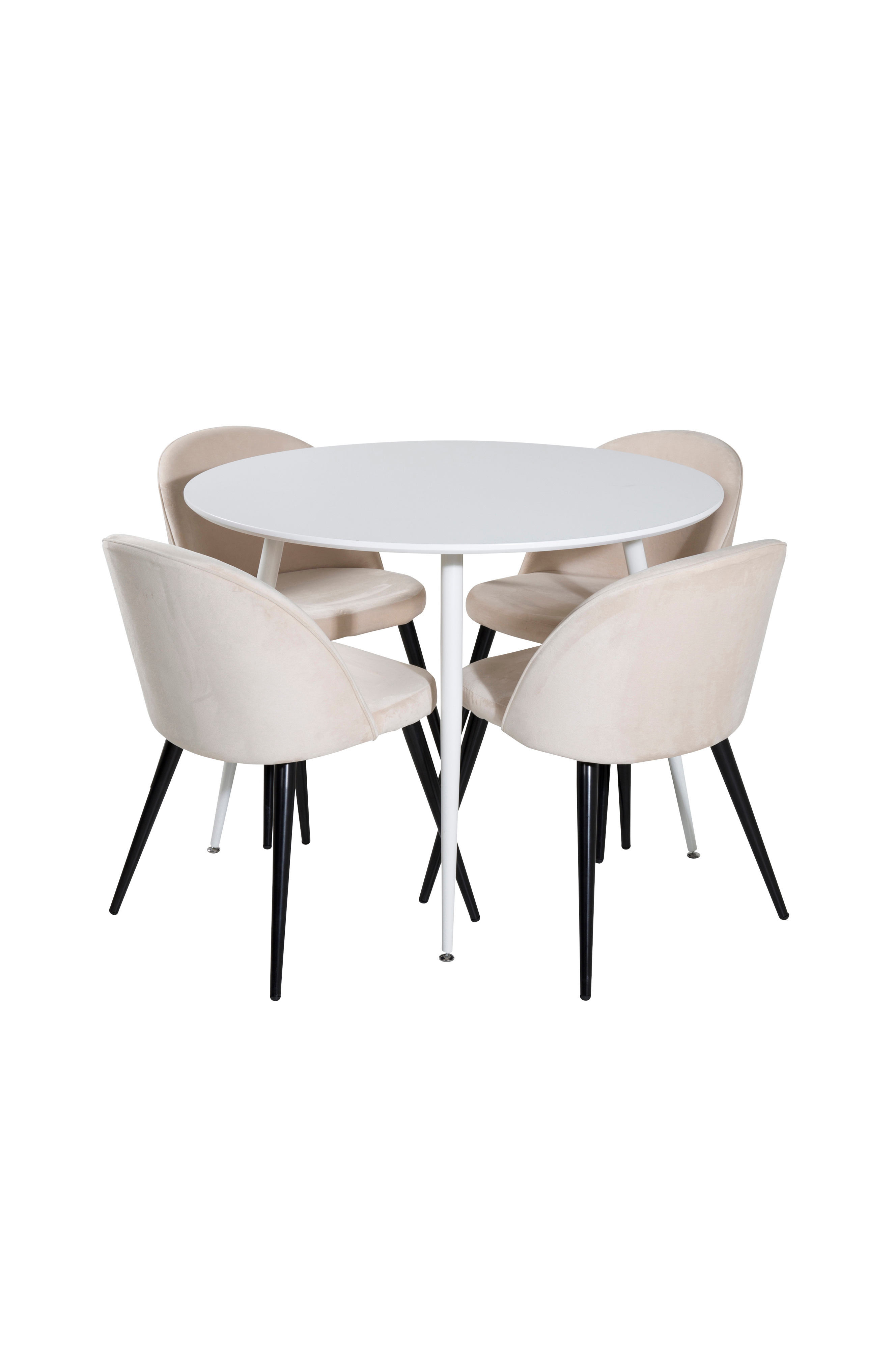 Pia matbord med en rund topp i MDF och bordsben i metall. Matchas med 4st Valleta matstolar med stolsits i sammet och stolsben i metall. Bord och stol kräver enklare montering. Bordets mått: Diameter: 100cm, Höjd: 75cm. Stolens mått: Sittdjup: 42,5cm, Sittbredd: 41cm, Sitthöjd: 46,5cm.