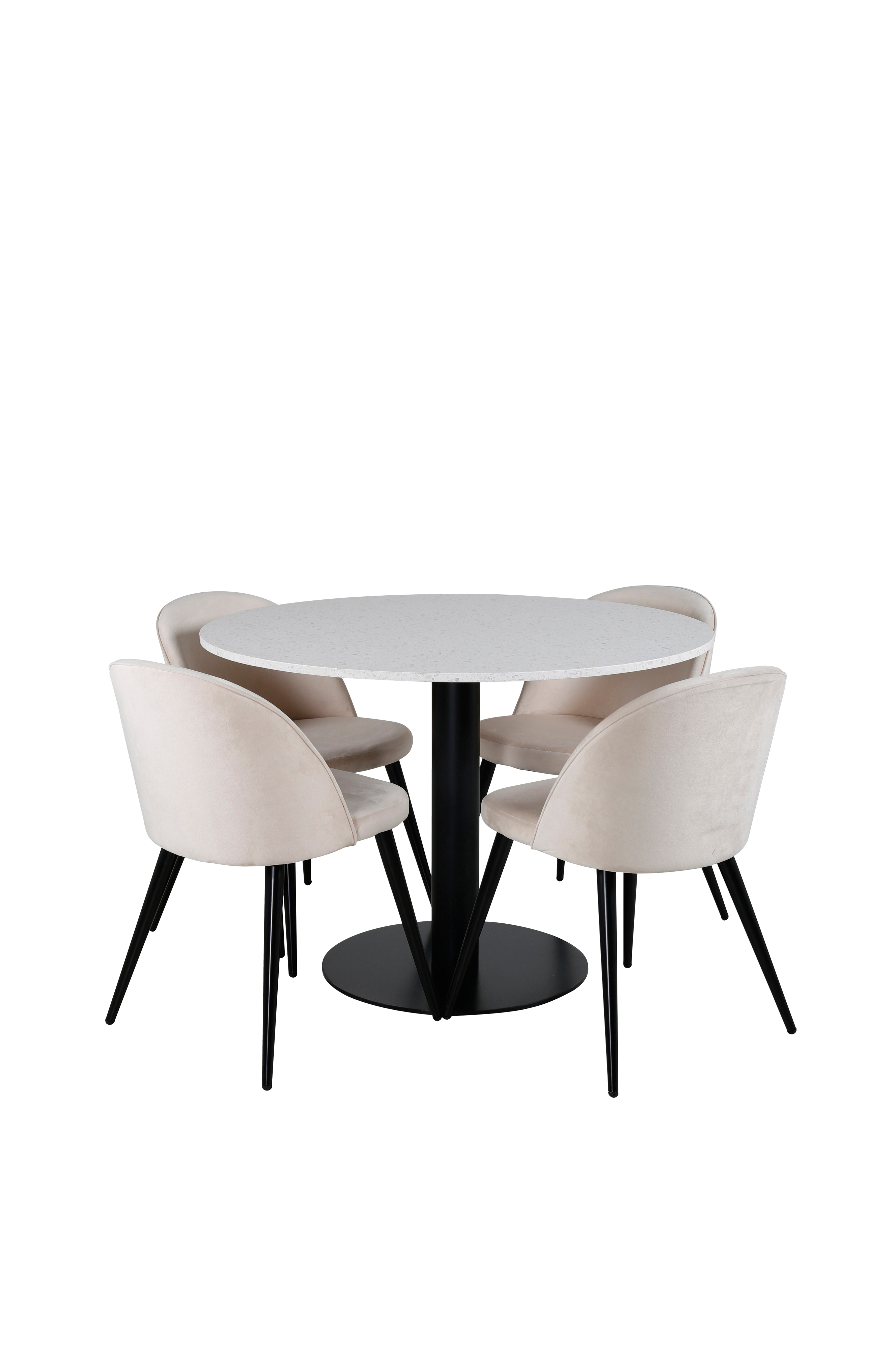 Razzia matbord med en rund bordstopp i terazzo och bordsben i metall. Matchas med 4 st Velvet matstolar med stolsits i sammet och stolsben i metall. Bord och stol kräver enklare montering. Bordets mått: Diameter: 106 cm, höjd: 75 cm. Stolens mått: Sittbredd: 41 cm, sittdjup: 42.5 cm, sitthöjd: 46.5 cm.