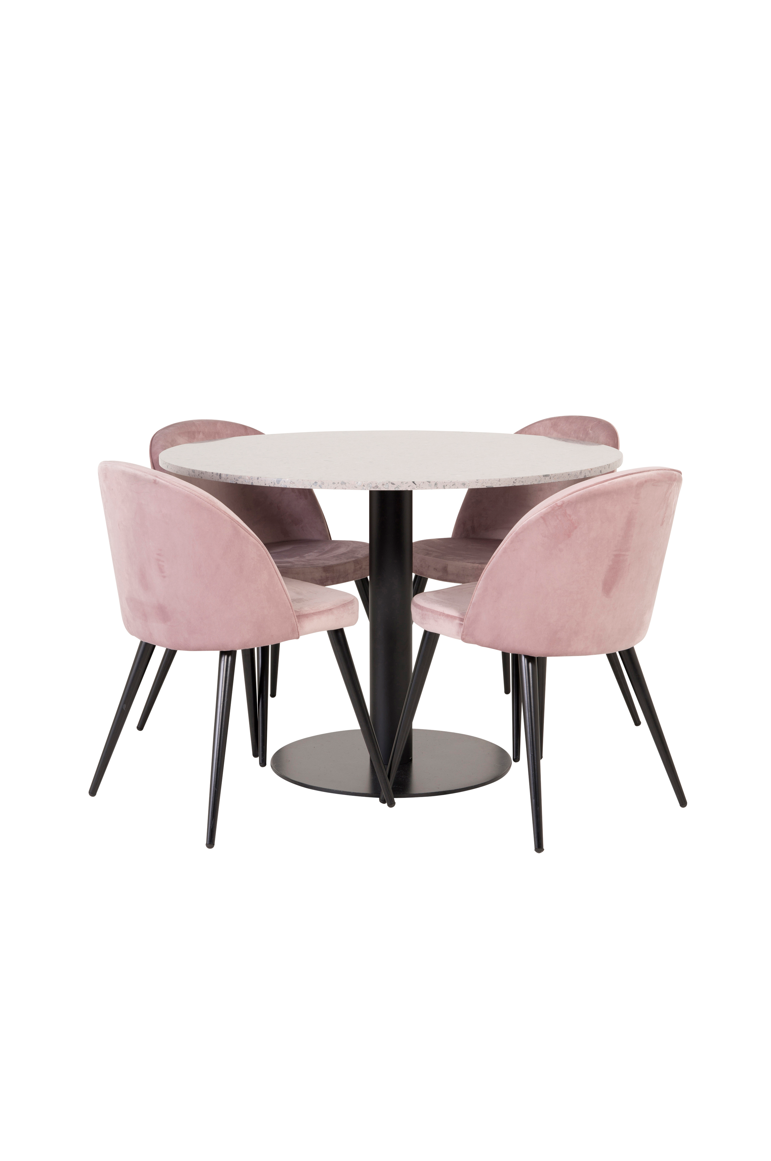 Razzia matbord med en rund bordstopp i terazzo och bordsben i metall. Matchas med 4 st Velvet matstolar med stolsits i sammet och stolsben i metall. Bord och stol kräver enklare montering. Bordets mått: Diameter: 106 cm, höjd: 75 cm. Stolens mått: Sittbredd: 41 cm, sittdjup: 42.5 cm, sitthöjd: 46.5 cm.