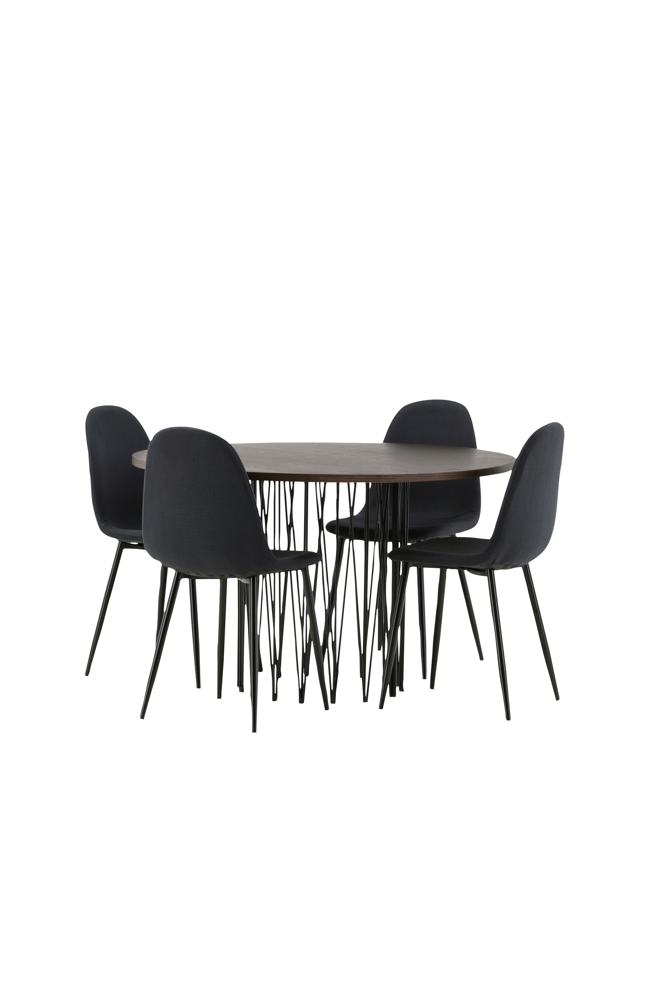 Den här matgruppen är lika stilren som praktisk! Vårt runda matbord Stone har en läcker Skandinavisk design som faller många i smaken. Bordet har en vacker brunfärgad bordsskiva i MDF med faner och en dekorativ cylinderformad stomme i svart metall. Här tillsammans med våra bekväma matstolar från serien Polar. Stolen har en helklädd design med en rundad rygg och sits i svart polyestertyg med mjuk stoppning och ben i svart pulverlackerad metall. Slipp kompromissa mellan bekvämlighet och snygg design!