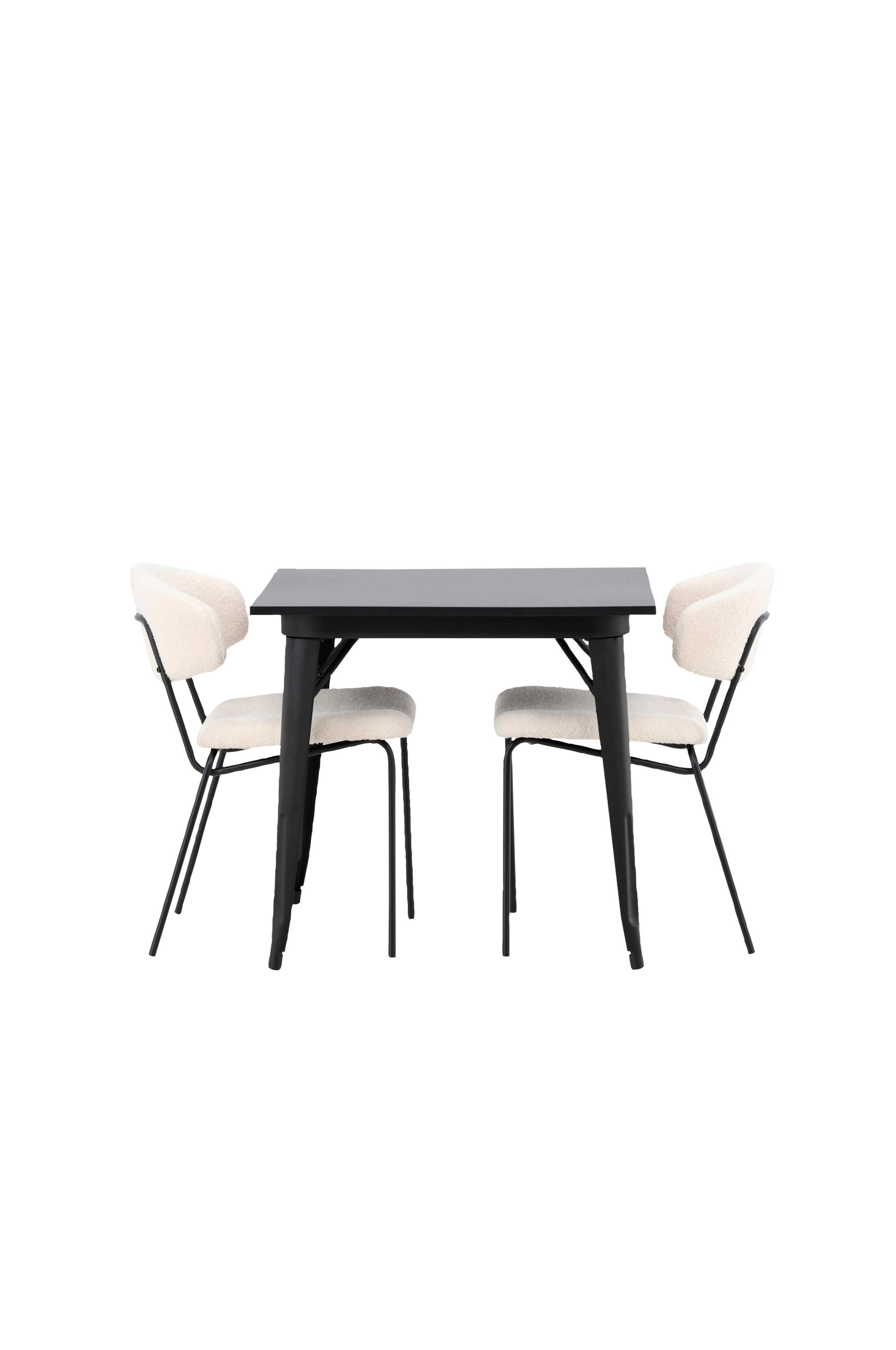 En charmig matgrupp för två - perfekt för det lilla köket! Det här matbordet från serien Tempe har en klassisk, kvadratisk utformning och en tidlös svart kulör. Bordsskivan är i svart MDF och bordsbenen i svart metall. Här i smakfull kombination med två matstolar från serien Chico. Stolarna har en minimalistisk och bekväm design med rygg och sits i boucletyg och en smal stomme i stål. Här får du ett blickfång som imponerar!