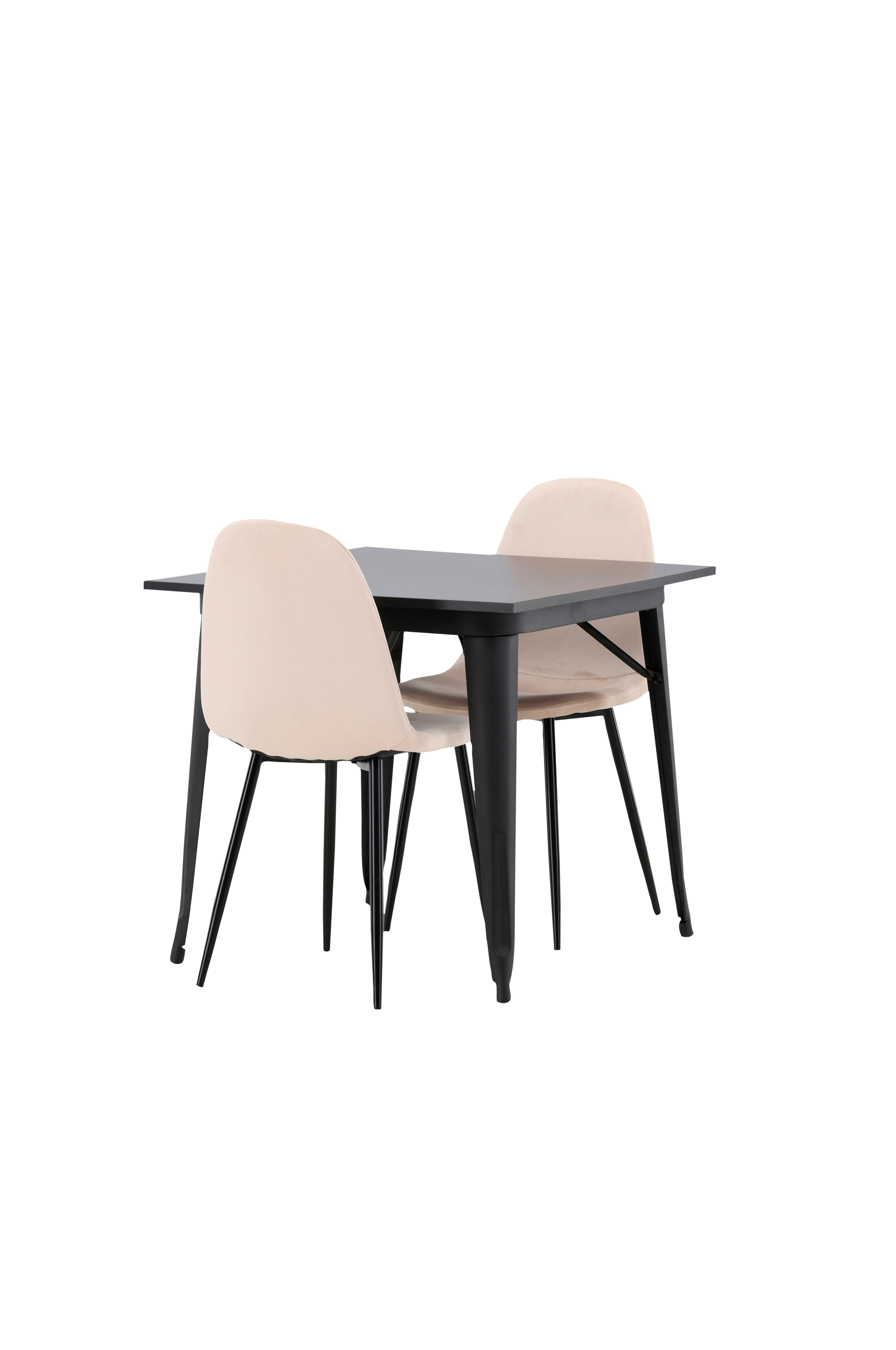 En charmig matgrupp för två - perfekt för det lilla köket! Det här matbordet från serien Tempe har en klassisk, kvadratisk utformning och en tidlös svart kulör. Bordsskivan är i MDF och bordsbenen i svart metall. Här i smakfull kombination med två matstolar från serien Polar i champagnefärgad nyans. Stolen har en helklädd design med en rundad rygg och sits sammetstyg med mjuk stoppning och ben i svart pulverlackerad metall. Slipp kompromissa mellan komfort och design!