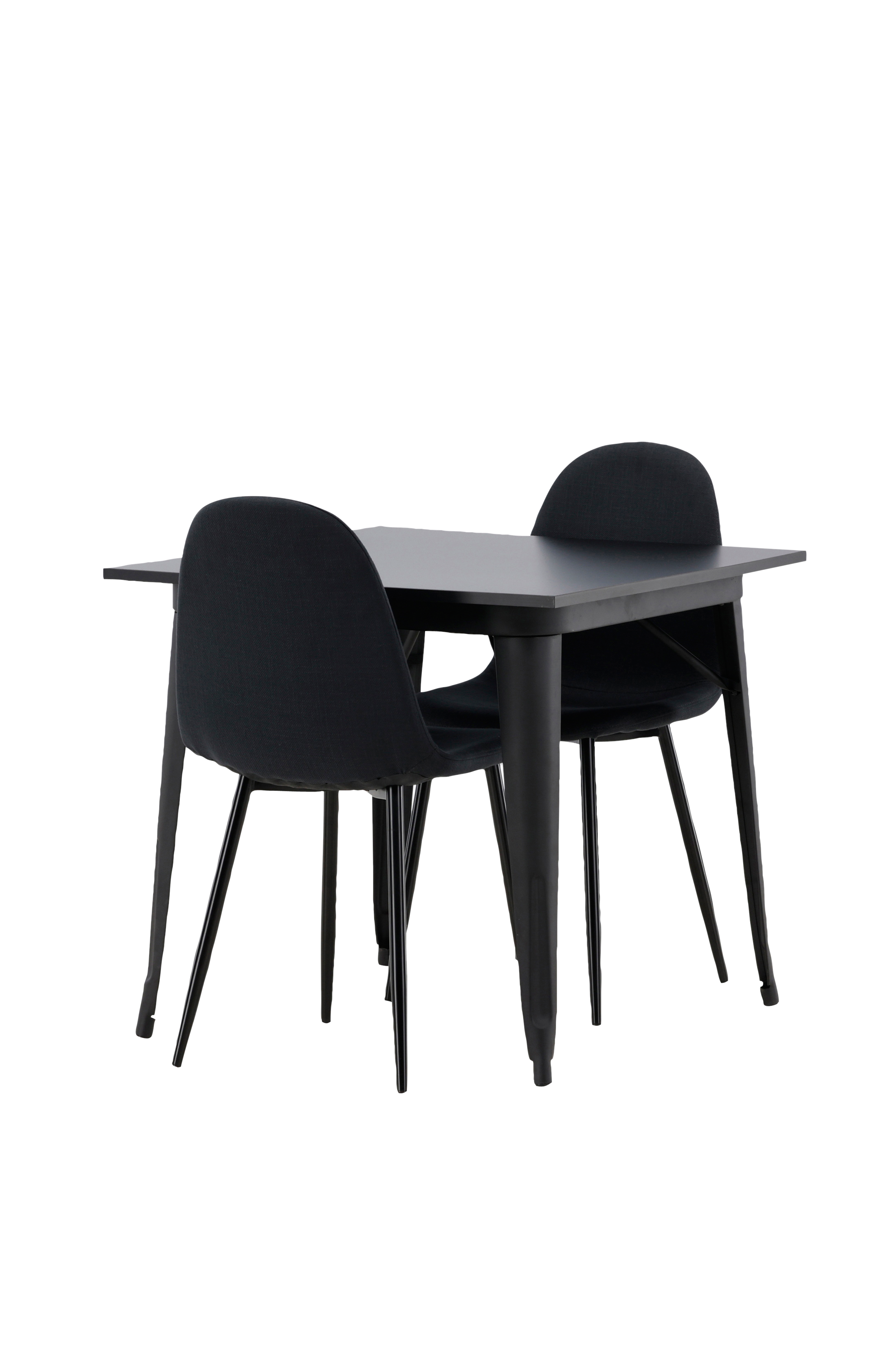 En charmig matgrupp för två - perfekt för det lilla köket! Det här matbordet från serien Tempe har en klassisk, kvadratisk utformning och en tidlös svart kulör. Bordsskivan är i svart MDF och bordsbenen i svart metall. Här i smakfull kombination med två matstolar från serien Polar i sotig nyans. Stolen har en helklädd design med en rundad rygg och sits i svart polyestertyg med mjuk stoppning och ben i svart pulverlackerad metall. Slipp kompromissa mellan komfort och design!