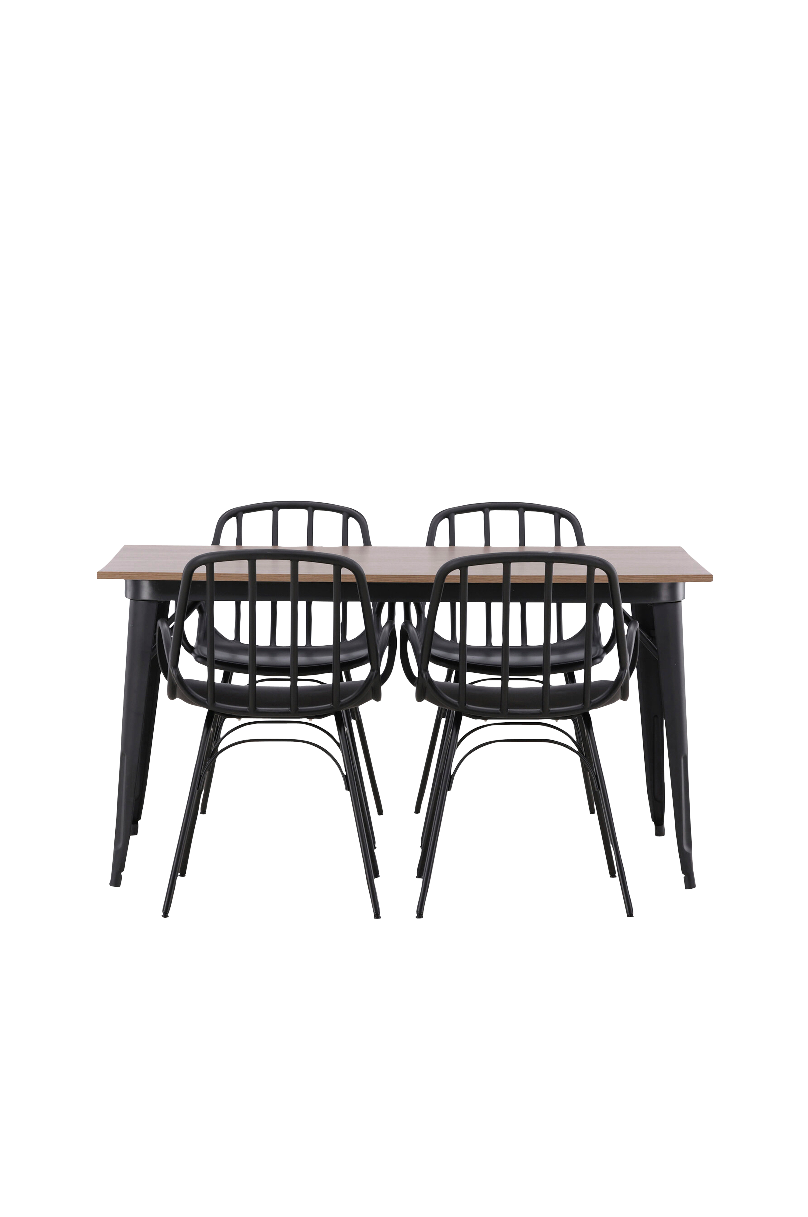 En matgrupp som utstrålar modernitet och nordisk design! Matbordet från serien tempe är både trendsäkert och slitstarkt. Tillverkad med en rektangulär bordsskiva i brun mdf och bordsben i metall. Här tillsammans med populära matstolar från serien dyrön. Stolen är lika stilren som praktisk, tillverkad i plast och stål. Sitsen har integrerade armstöd och en ribbad design i den lätt rundade ryggen. Möblera hemmets hjärta inbjudande och skapa en trivsam atmosfär!
