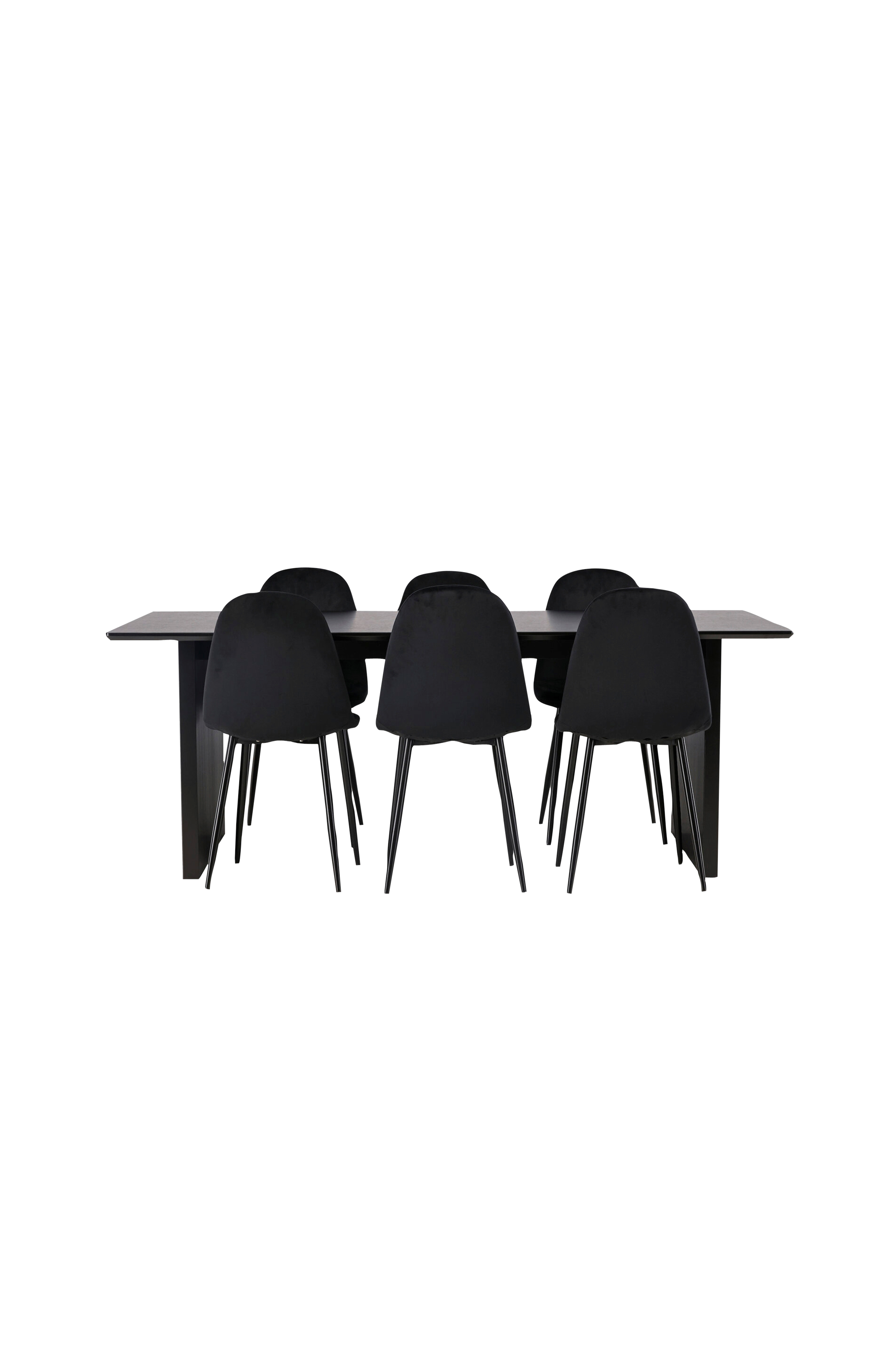 Sotigt , stilren och elegant matgrupp! Det rektangulära matbordet vail har raka nordiska former och är tillverkat i slitstarkt mdf i en sotig färg. Bordsskivan är tunn i en rektangulär utformning och balanserar på två bastanta träskivor som utgör underredet. Här i snygg kombination med venture designs matstolar från serien polar. Stolen har en helklädd design, ben i pulverlackerad metall samt rundad rygg och sits i sammetstyg med mjuk stoppning. Gör vardagen till en fest med en lyxig matgrupp!
