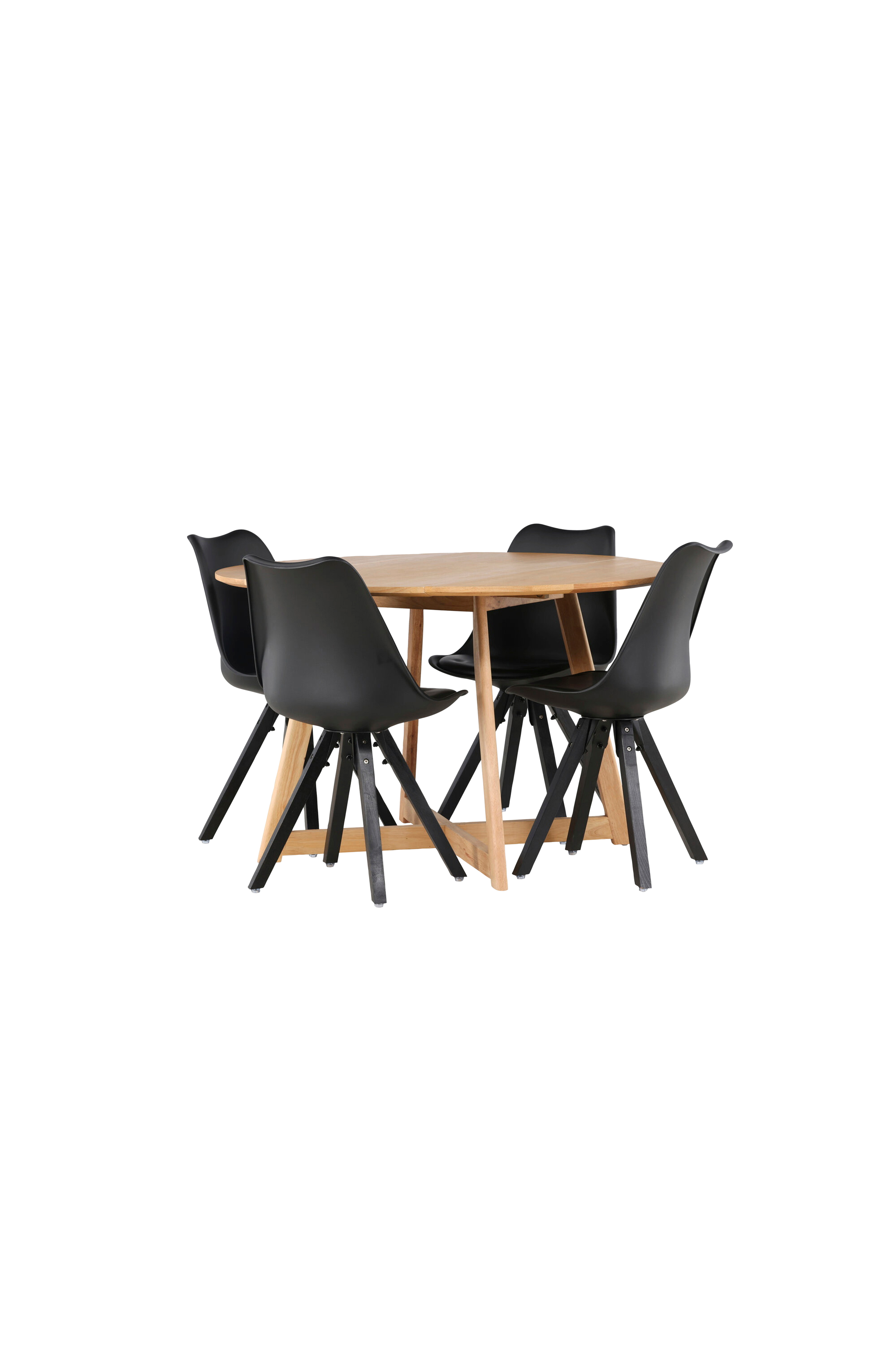 det runda matbord yakidon har en rund toppskiva med nedfällbara ändar som snabbt anpassar sig efter dina behov. Det ger dig flexibilitet för både små och stora sällskap. Med lätta utsvängda ben som bildar ett vackert kryss på marken får bordet också en modern och stilfull touch. Bordet är av högkvalitativt ek-liknande mdf och gummiträ, vilket ger en känsla av tidlöshet och stabilitet. Men det är inte bara vackert att titta på, det är även praktiskt och lätt att rengöra. Här matchas matbordet med de underbara matstolar från serien zeno. Med sin eleganta enkelhet kompletterar stolen zeno bordet yakidon på ett helt klockrent sätt.