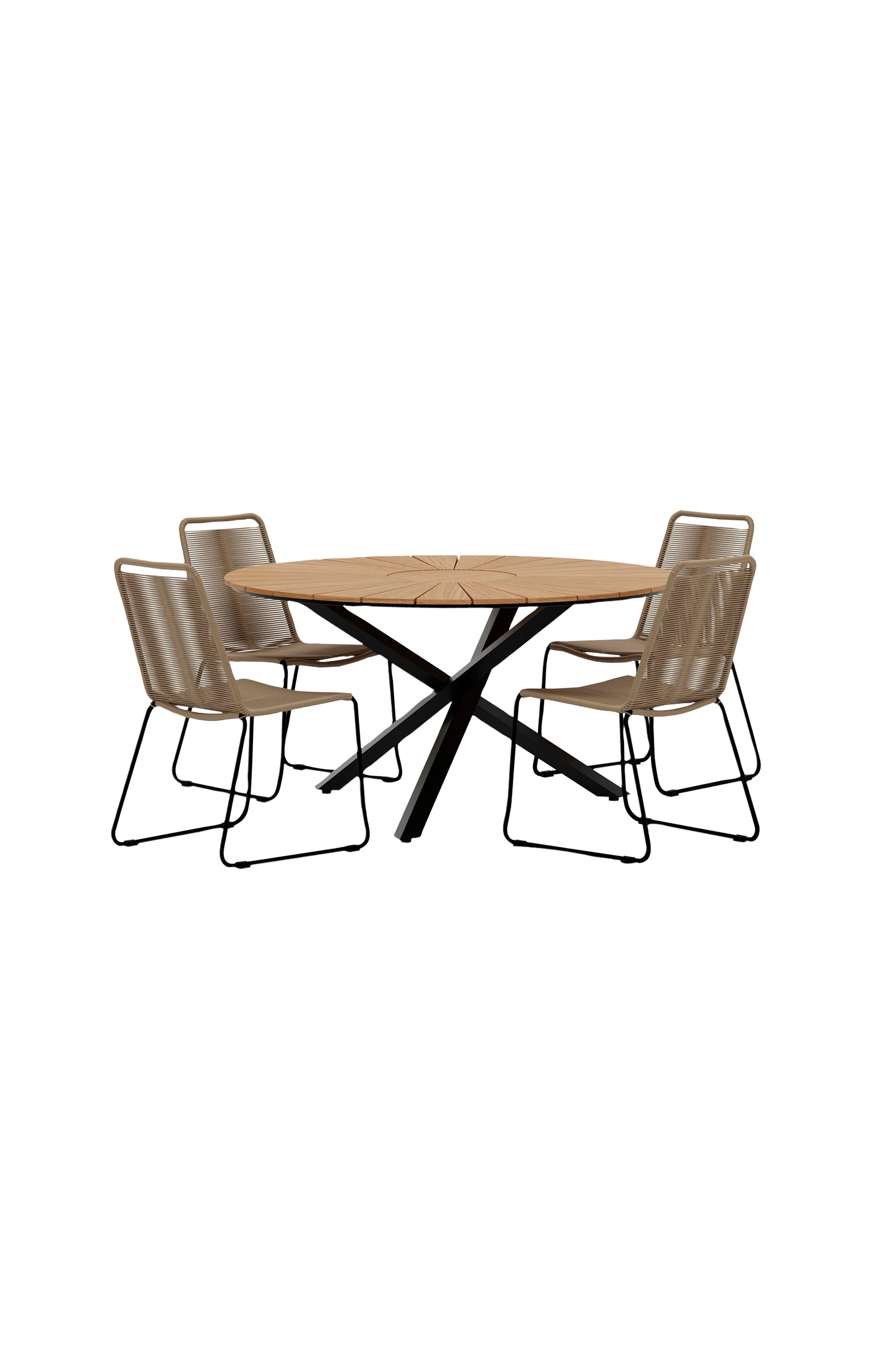 Skapa en varm och inbjudande uteservering med matgruppen lindos & mexico. De naturinspirerade lindos-stolarna har en elegant beige repsits som ger ett harmoniskt och mjukt uttryck i solrummet eller på uteplatsen. Den rena designen gör stolarna lätta att kombinera med olika miljöer, och de är dessutom stapelbara när du behöver spara utrymme. Det runda mexico-matbordet samlar enkelt vänner och familj kring sin generösa form. Den vackra bordsskivan i teak tillsammans med det svarta metallunderredet skapar en modern och tidlös kontrast som lyfter hela uterummet. Den runda formen gör att ingen hamnar vid kanten - perfekt för vardagliga middagar och somriga sammankomster. Tillsammans bildar lindos-stolarna och mexico-bordet en elegant och välkomnande matgrupp som förhöjer varje ögonblick utomhus.