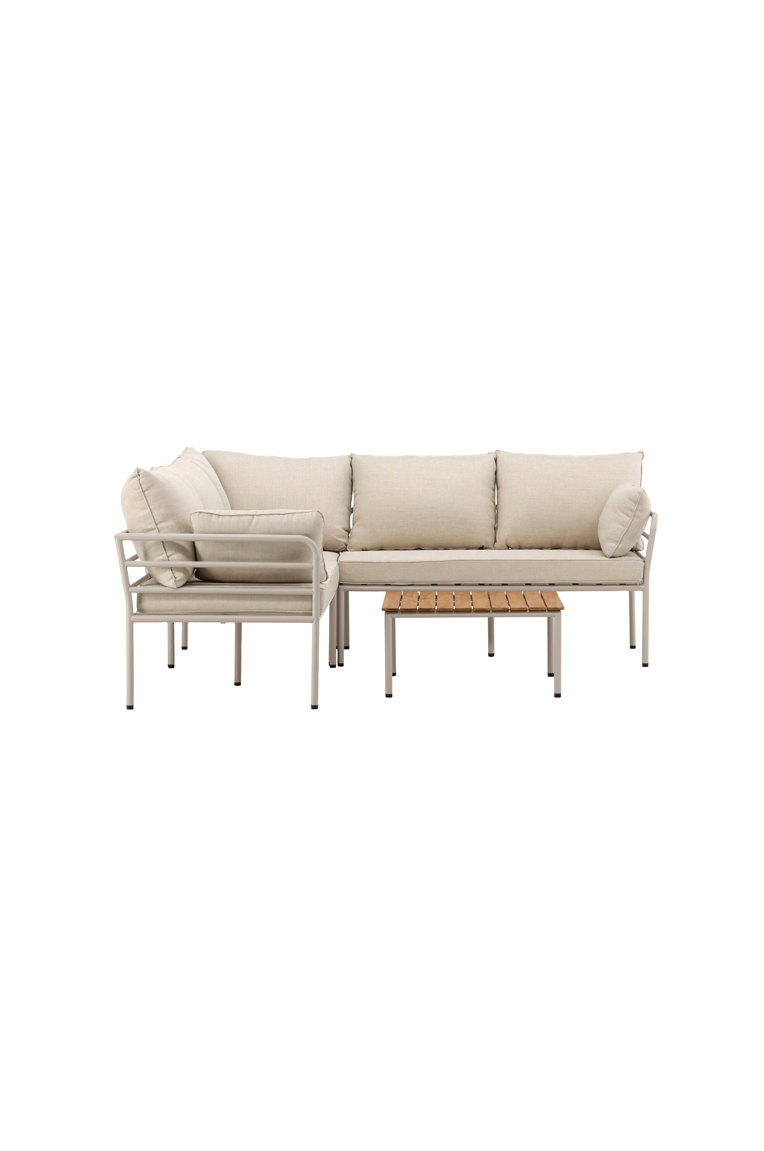 Upptäck den underbara avkopplingen utomhus med vår exklusiva loungegrupp - penh. Med en robust stålram för soffan och eleganta detaljer i akacia på bordet är penh en perfekt kombination av hållbarhet och stil.