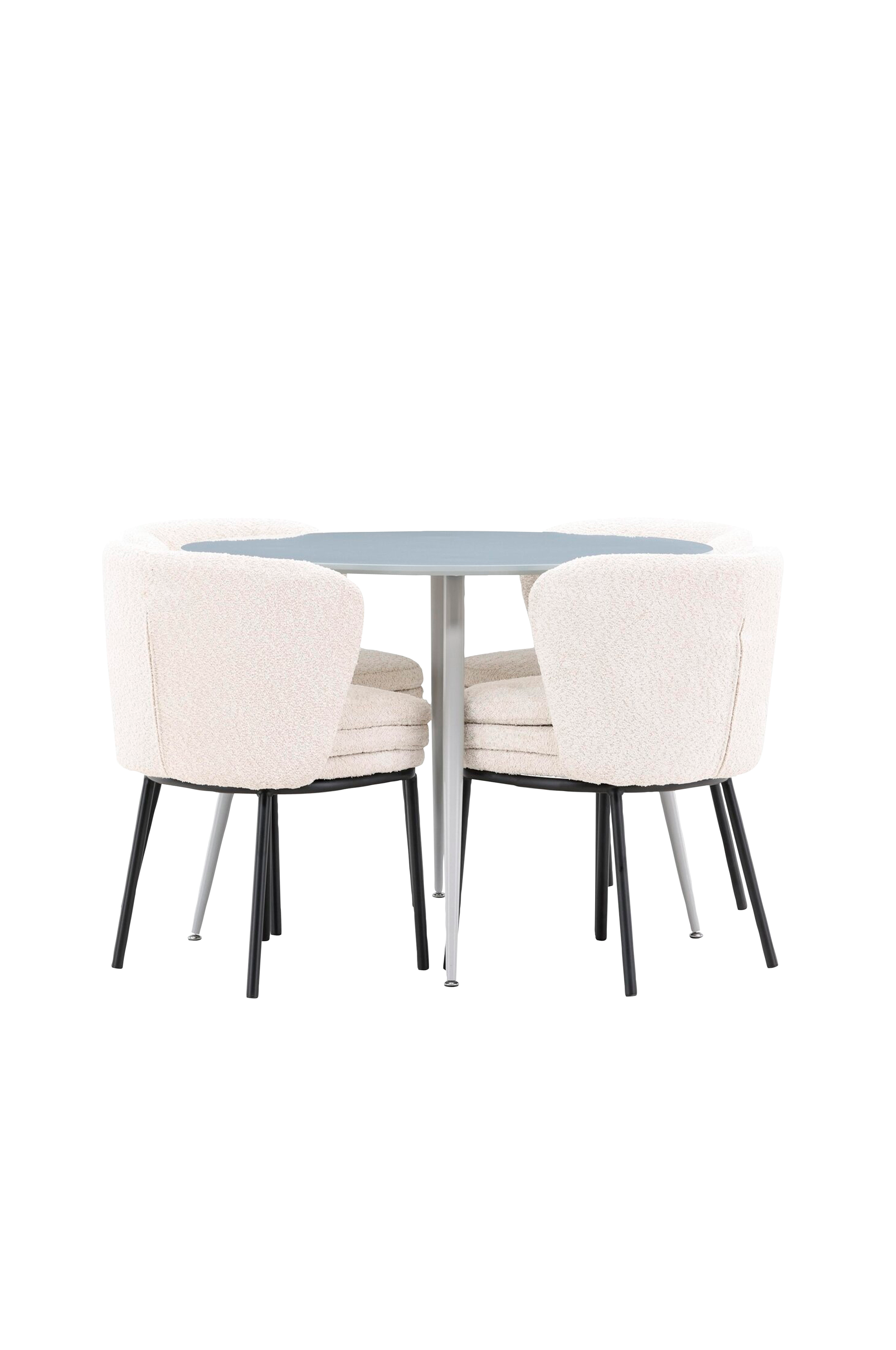 de fyra medföljande agnes-stolarna är en perfekt matchning till bordet med sin moderna och eleganta design. Stolarna är klädda i mjuk bouclé, vilket ger en lyxig och bekväm sittupplevelse. Bouclétyget är känt för sin struktur och mjukhet, vilket gör att du och dina gäster kan sitta bekvämt under långa måltider och trevliga samtal. Stolarna skapar en vacker kontrast mot bordet och ger din matsal en fräsch och inbjudande atmosfär.