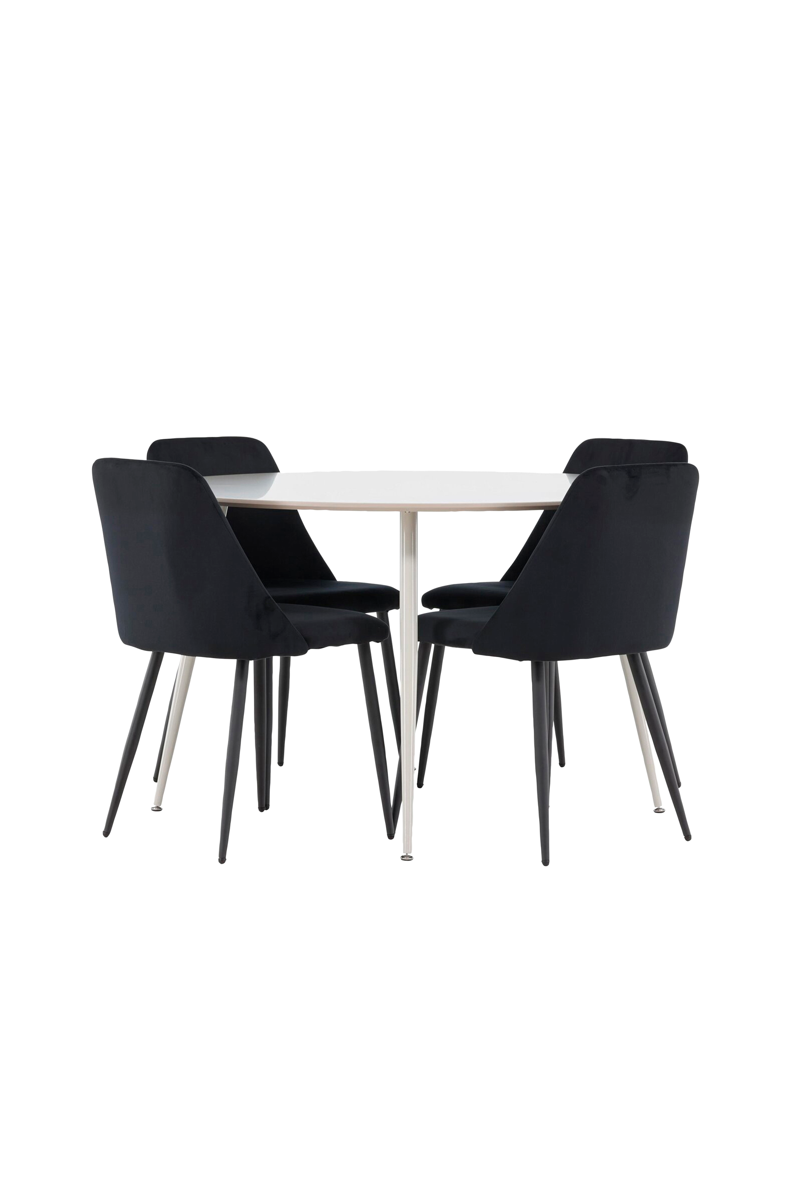 Skapa en sofistikerad och inbjudande matplats med vår eleganta matgrupp som kombinerar det eleganta Plaza-bordet med de lyxiga Night-stolarna. Denna matgrupp är perfekt för både vardagliga middagar och festliga tillfällen och ger din matsal en modern och elegant atmosfär. Plaza-bordet, som är tillverkat av mdf, ger en mjuk och harmonisk känsla till din matsal. Med en generös diameter på 120 cm erbjuder bordet gott om utrymme för mat och samtal, samtidigt som den runda formen skapar en balanserad och inbjudande miljö. Bordets robusta konstruktion säkerställer långvarig användning och stabilitet. De fyra nattfåtöljerna kompletterar bordet perfekt med sina eleganta sitsar och smäckra stålben. Dessa stolar erbjuder både komfort och stil, vilket gör dem idealiska för långa, trevliga måltider med familj och vänner. Deras moderna design med höga ryggstöd och mjuka sitsar ger din matsal en sofistikerad och modern touch. Denna matgrupp är en perfekt blandning av estetik och funktionalitet, vilket gör den till ett utmärkt val för dig som vill ha en elegant och bekväm matplats. Uppgradera din matsal med den eleganta kombinationen av Plaza-bordet och nattstolarna, och skapa en plats där minnen och glädje delas.