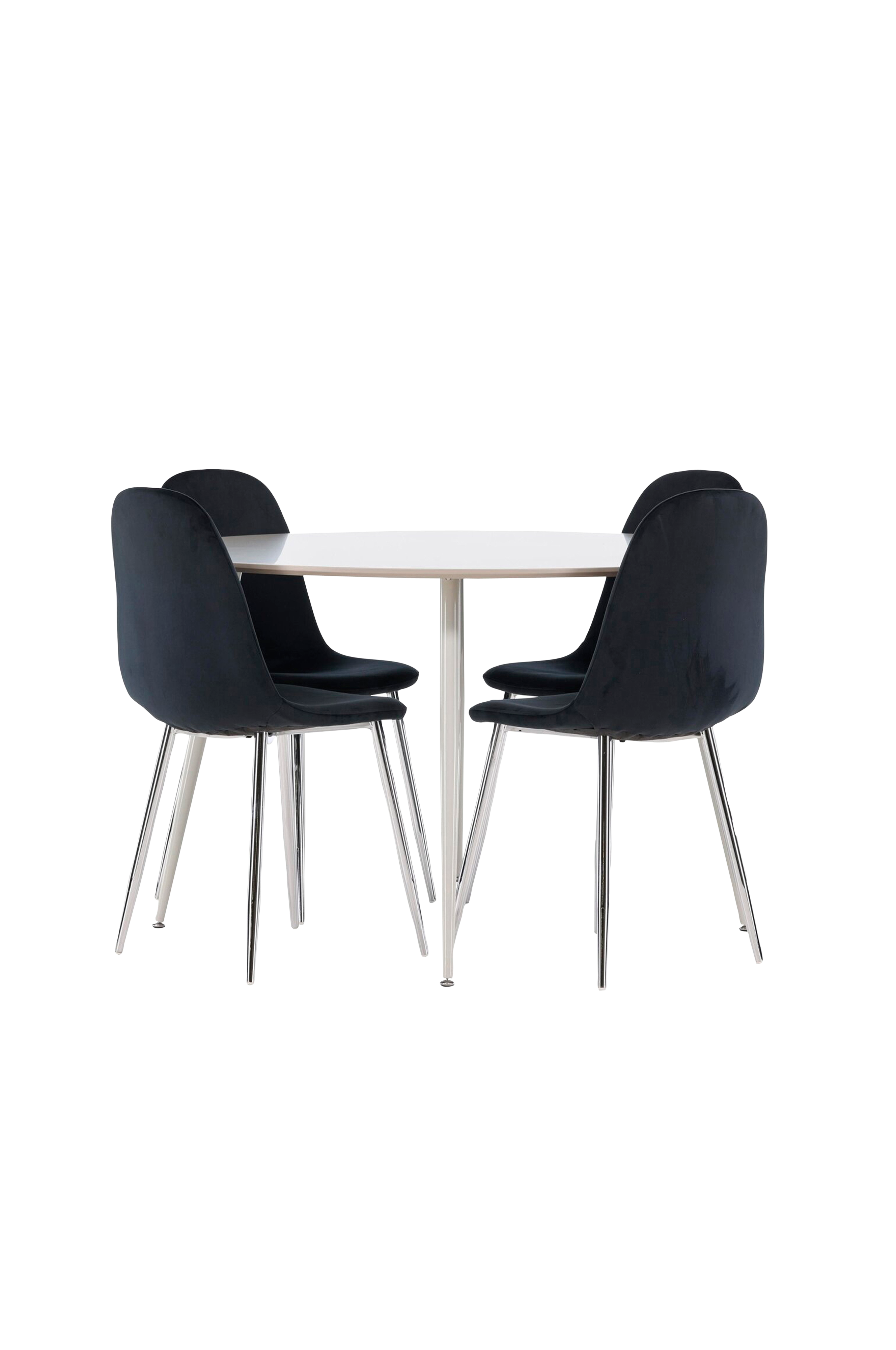 Skapa en sofistikerad och inbjudande matplats med vår eleganta matgrupp som kombinerar det eleganta bordet plaza med de lyxiga stolarna polar. Denna matgrupp är perfekt för både vardagsmiddagar och festliga tillfällen och ger din matsal en modern och elegant känsla. Plaza-bordet, som är tillverkat av mdf, ger en mjuk och harmonisk atmosfär. Med en diameter på 120 cm erbjuder bordet gott om utrymme för mat och samtal, samtidigt som dess runda form skapar en balanserad och inbjudande miljö. Bordets robusta konstruktion garanterar långvarig användning och stabilitet. De fyra polarstolarna kompletterar bordet perfekt med sina eleganta sitsar klädda i sammet. Dessa stolar erbjuder både komfort och stil, vilket gör dem idealiska för långa, trevliga middagar med familj och vänner. Deras moderna design med höga ryggstöd och mjuka sitsar ger din matsal en sofistikerad och modern touch. Denna matgrupp är en perfekt blandning av estetik och funktionalitet, vilket gör den till ett utmärkt val för dig som vill ha en elegant och bekväm matplats. Uppgradera din matsal med kombinationen av Plaza-bordet och Polar-stolarna och skapa en plats där minnen och glädje delas.