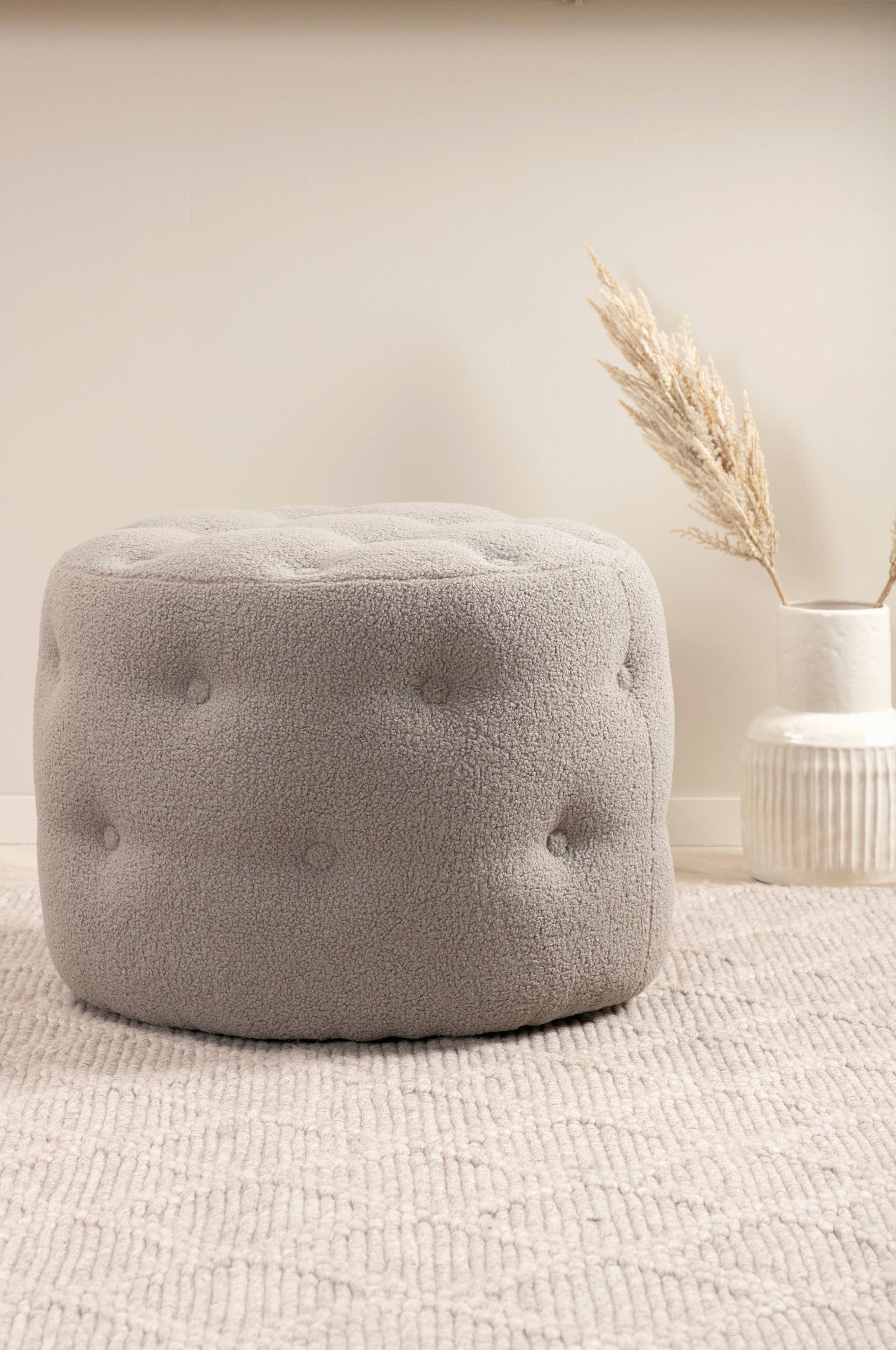 Benjamin sittpuff i trendigt teddytyg. Sittpuffens mått: Höjd: 44cm, Diameter: 55cm.