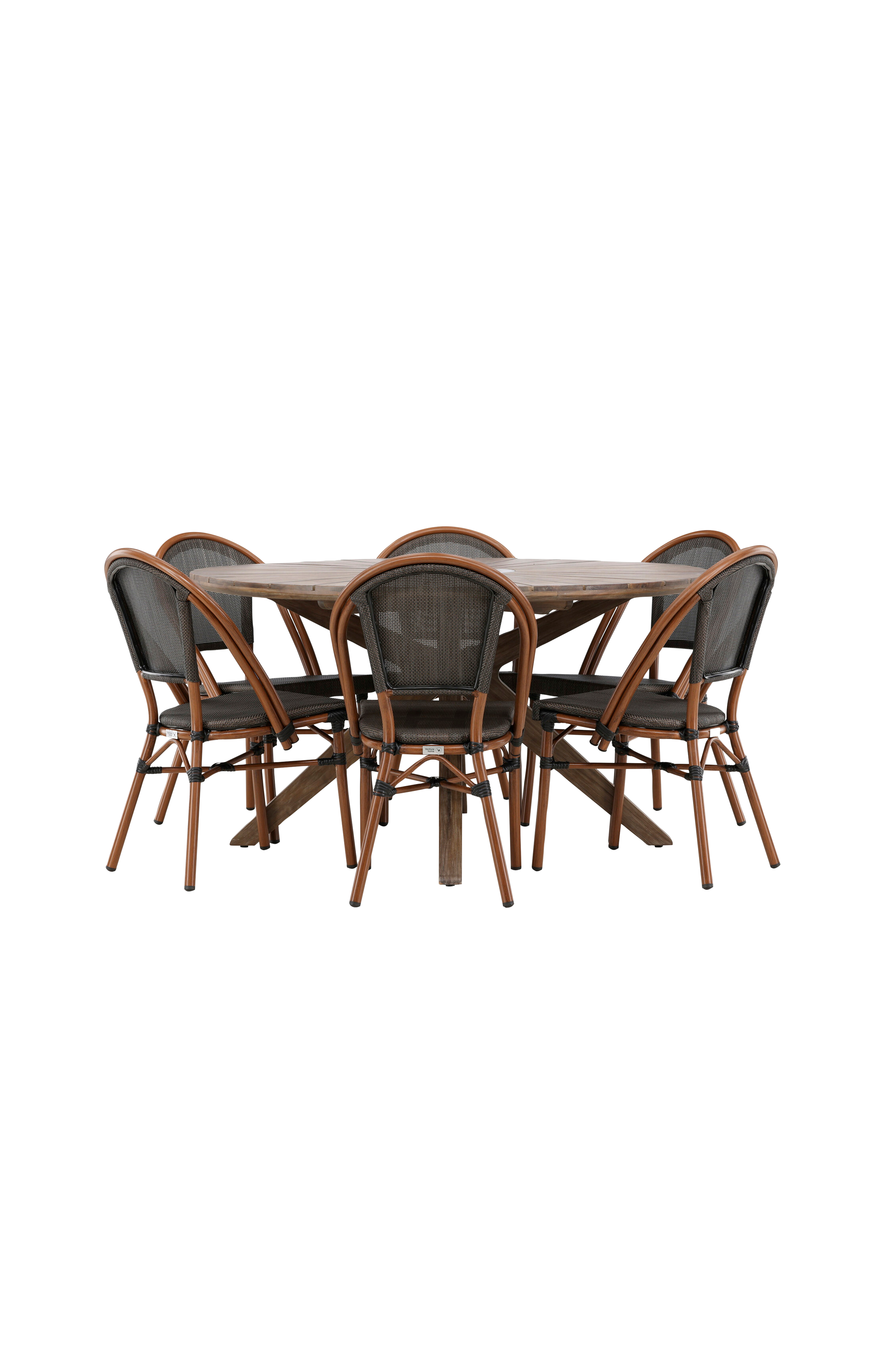 guarda -stolarna, med sitsar i teslinmaterial och ben i aluminium, har en minimalistisk och trendig look. Deras enkla design smälter sömlöst in i omgivningen och skapar en harmonisk grund för dina matupplevelser utomhus. Bordet rosario är mittpunkten i denna ensemble, med sin konstruktion i akaciaträ och en generös diameter på 140 cm. Det stora bordet rymmer bekvämt sex personer för trevliga sammankomster utomhus.