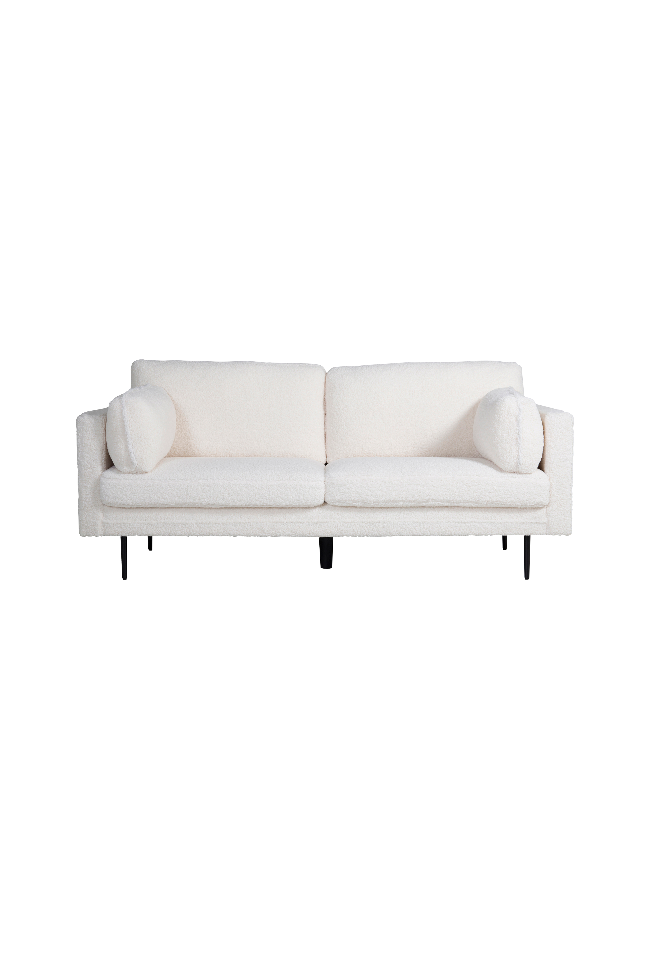 Boel 3-sitssoffa i 100 % teddy polyester och soffben i metall. Sittbredd 181 cm. Höjd till armstöd 70 cm. Höjd på ben 20,5 cm. Tjocklek på sittdynor 15 cm och ryggdynor 20,5 cm. Vikt: 43 kg. Martindale: 10000. Dynor och kuddar har fast klädsel (ej avtagbar). Soffan kräver enklare montering.
