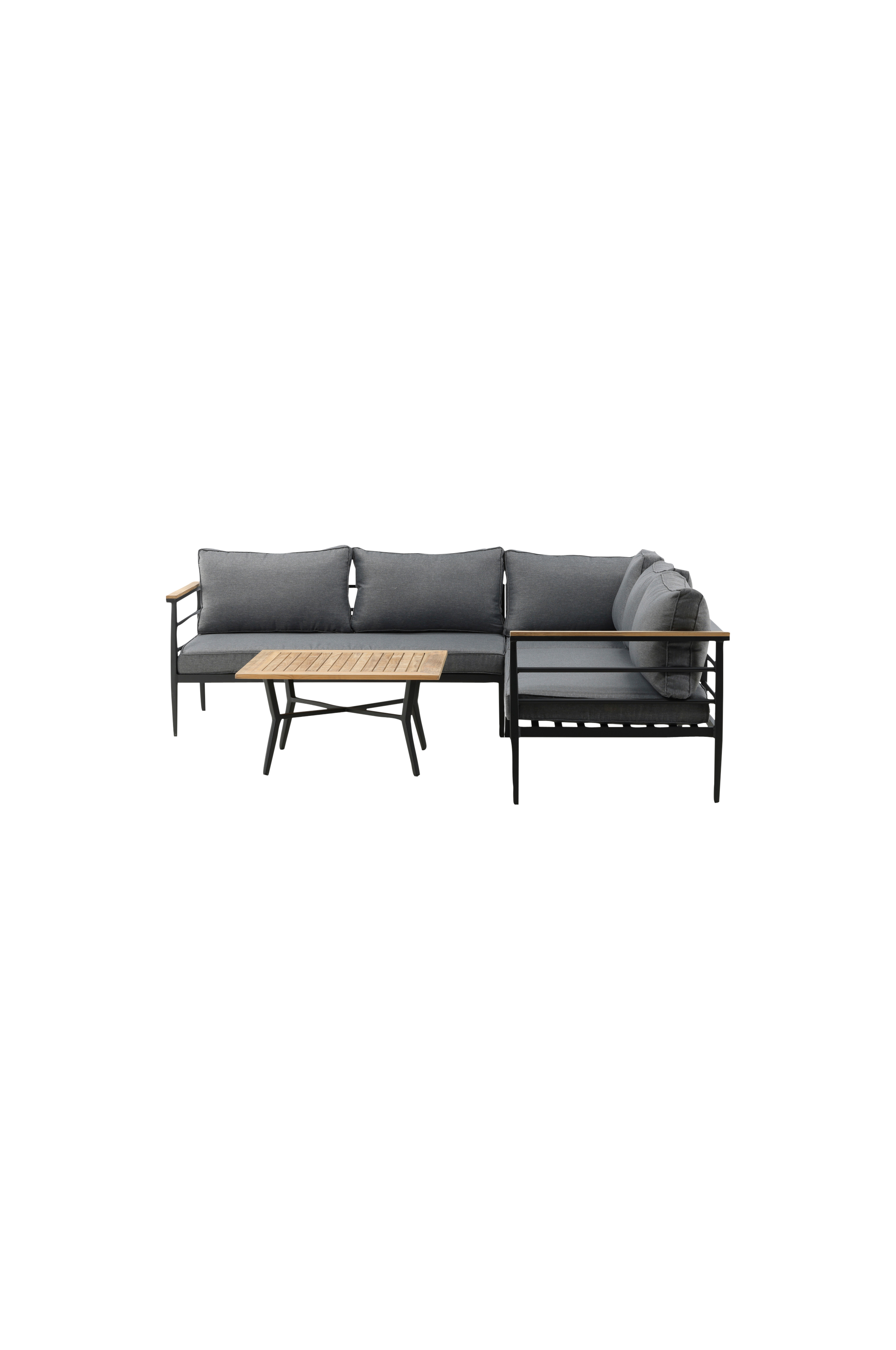 Skapa en charmig mittpunkt på uteplatsen att samla nära och kära kring i sommar! Mexico är en vackert matchande, modern soffgrupp i stilrent utförande och iögonfallande design. Hörnsoffan är tillverkad i pulverlackerad metallstomme och har integrerade armstöd med läckra teakdetaljer. Mjuka dynor inkluderas samt ett lågt soffbord med ett underrede i pulverlackerad metall och en bordsskiva i teak. En soffgrupp som garanterat kommer göra succé varma sommarkvällar!