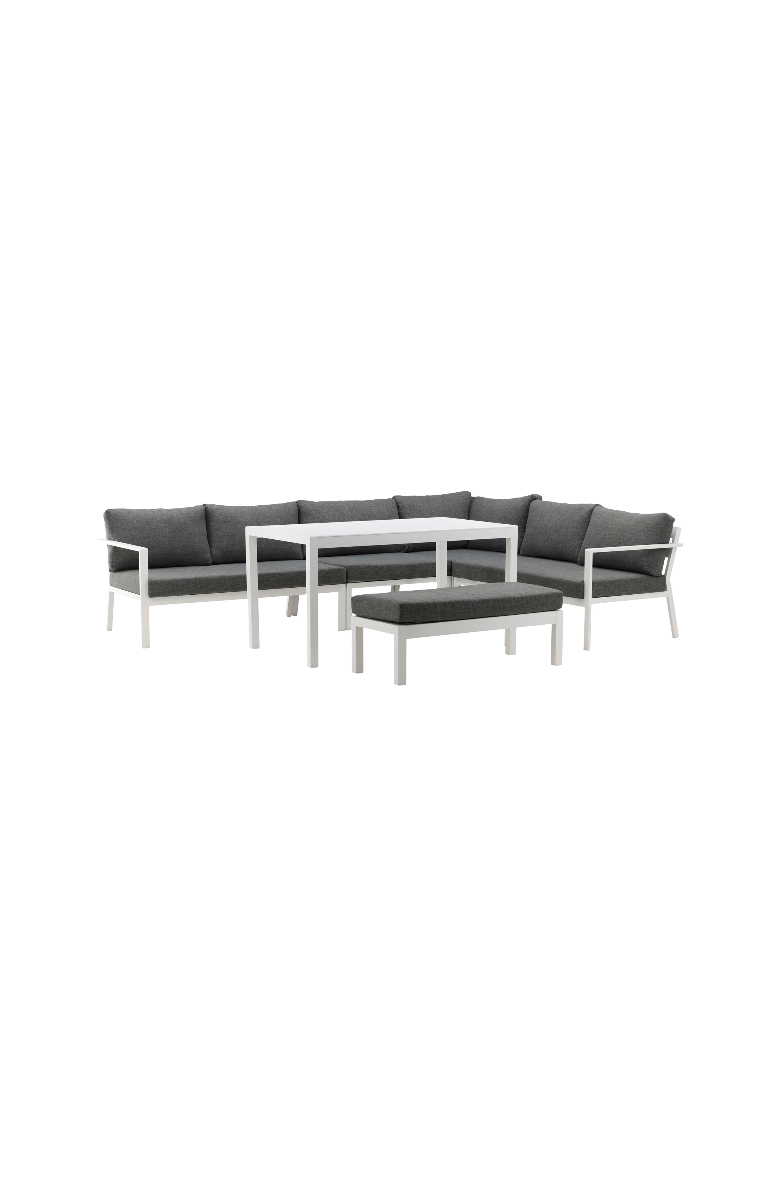 Ramos hörngrupp fungerar utmärkt för er som umgås många och har en större altan eller uteplats! Med sin tidlösa design och tåliga material är det en möbel som fungerar under många år. Perfekt för en fika eller varför inte läsa en bok i solen? Stommen är i aluminium och med dynor i stilfull kulör.