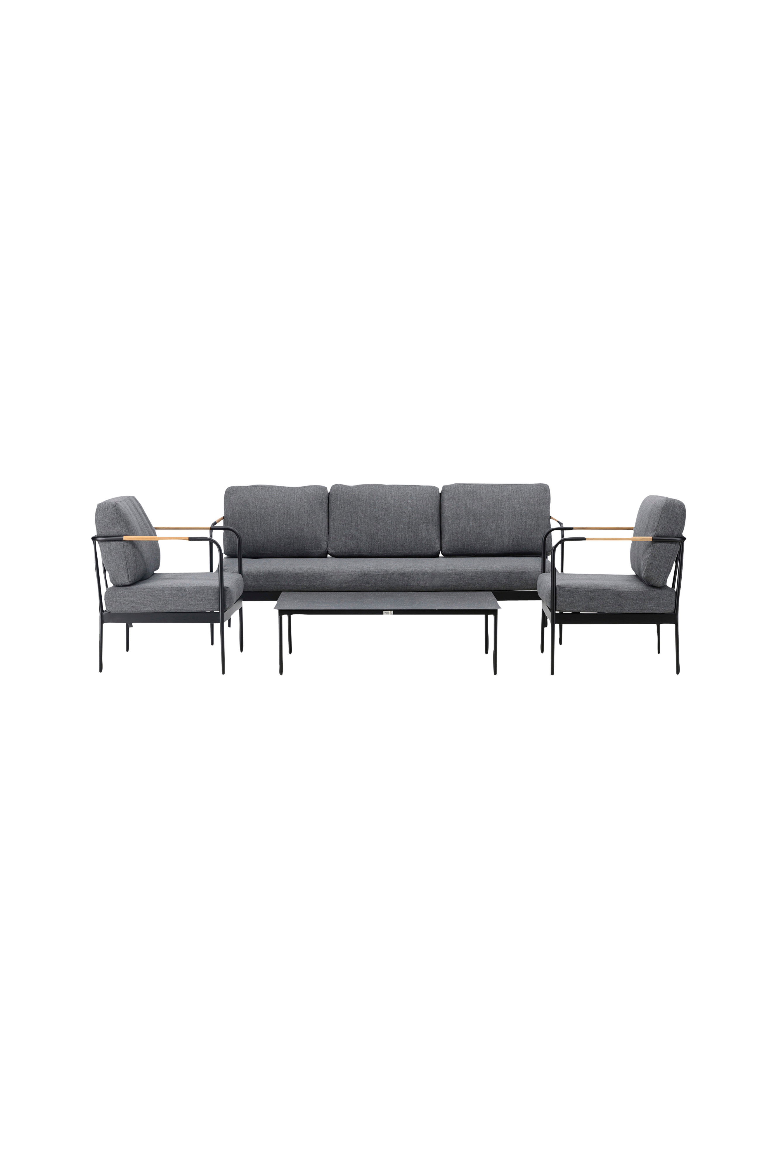 En nätt stilren soffgrupp i modern design. Soffgruppen består av en tresitssoffa och två fåtöljer tillverkade i en nätt stålram. Till gruppen tillkommer mjuka dynor i en tidlös kulör samt ett lågt soffbord med en grå bordsskiva tillverkat i stål. Tillsammans skapar de en stilfull helhet att placera på uteplatsen. Bord: höjd: 35cm, bredd: 70cm, längd: 120cm|stol: höjd: 73,5cm, bredd: 70cm, djup: 70cm| soffa: djup: 73cm, höjd: 73,5cm, bredd: 210cm