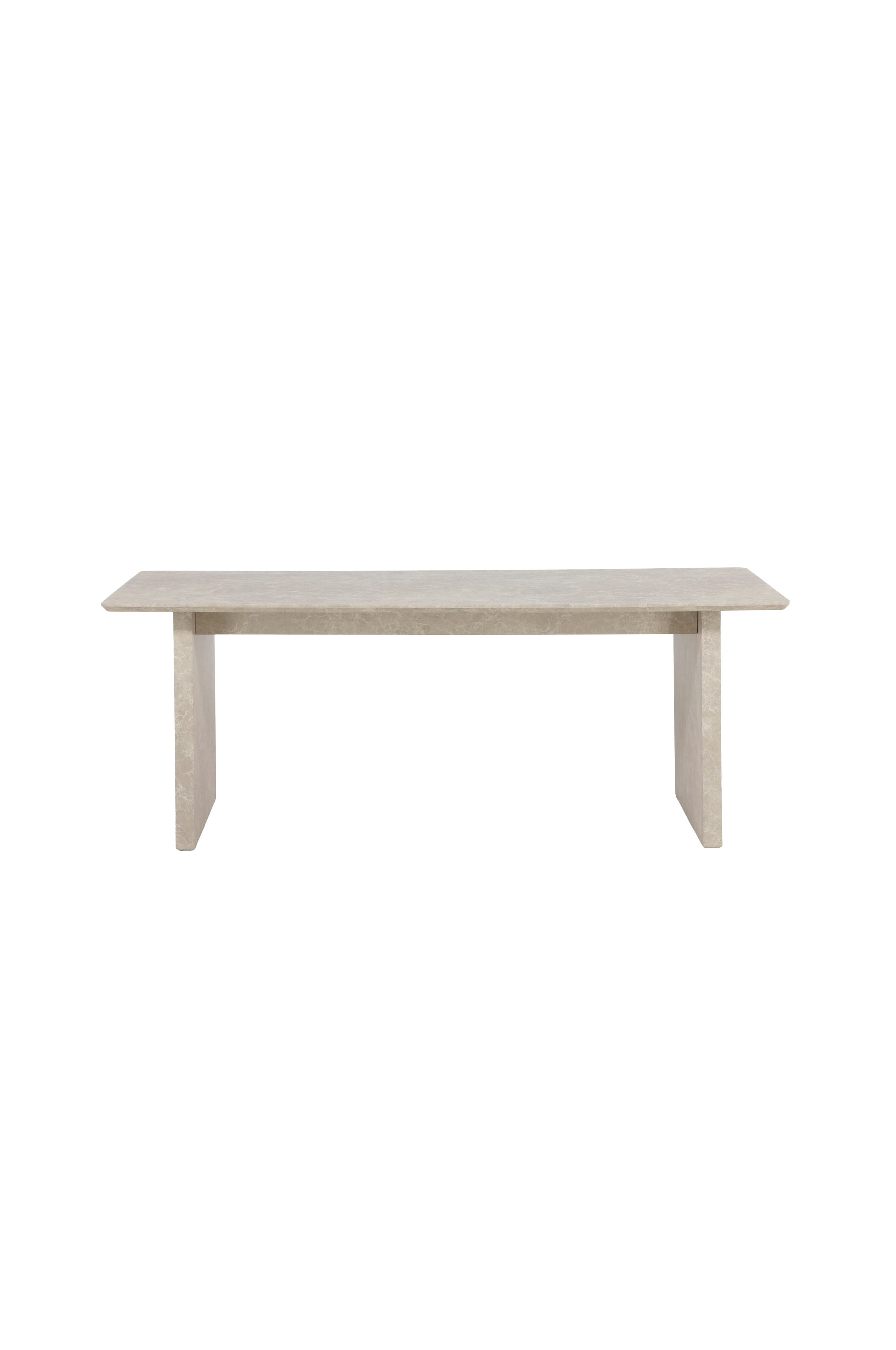 Vail är ett snyggt och rymligt rektangulärt matbord som mäter 200 x 100 cm - perfekt för både vardagliga måltider och festliga tillfällen. Både bordsskivan och de två benen är utformade i en elegant beige marmorlook, vilket ger bordet en lyxig och tidlös känsla.