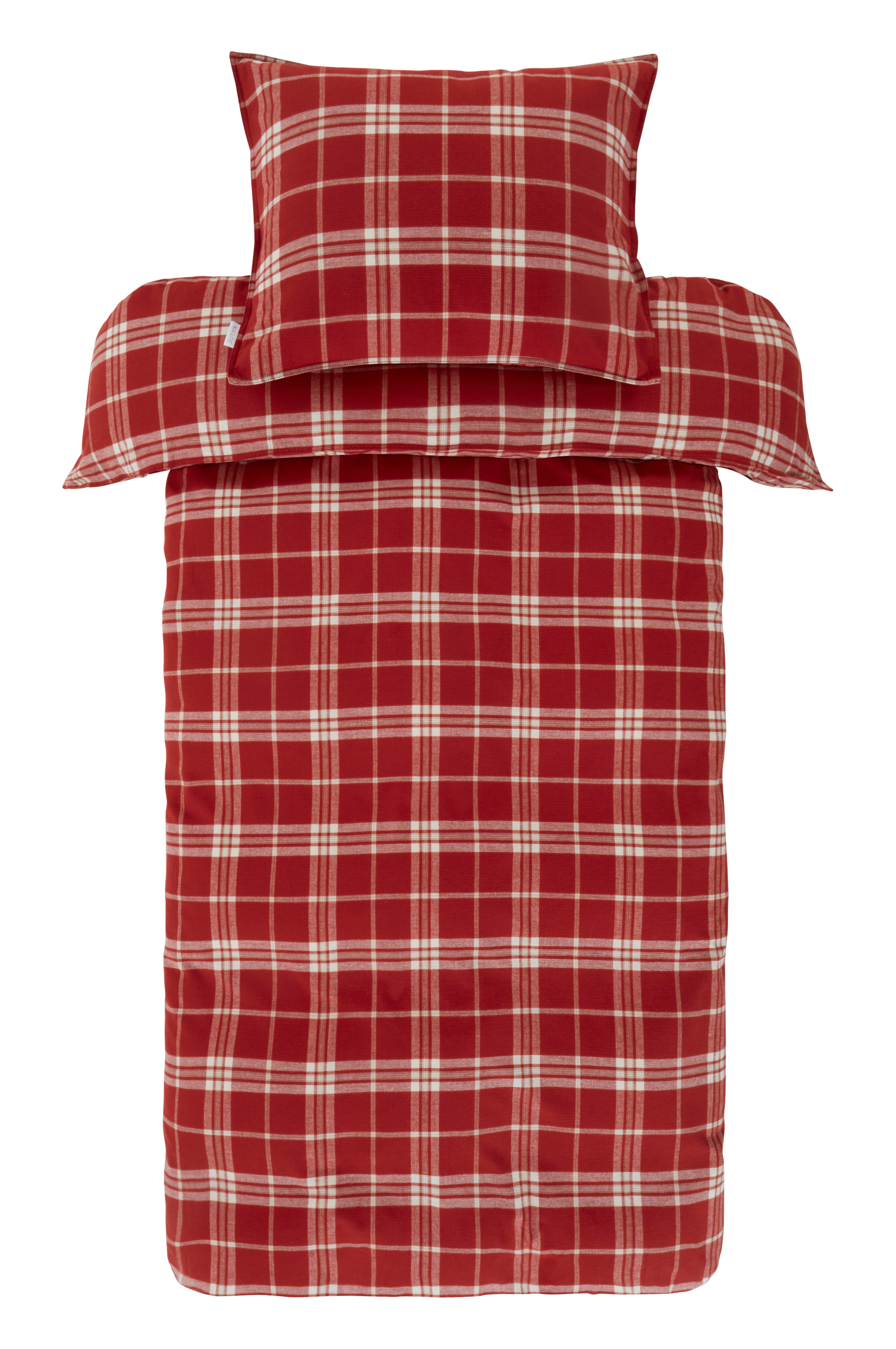 Påslakanset i två delar med ett påslakan och ett örngott i mjuk bomullsflanell med vävt rutmönster. Rutigt har klassisk charm och flanell är extra mjukt och mysigt och värmer skönt. Sängkläderna i bäddprogrammet VILMA har dubbelsöm runt om. Påslakanet har små tryckknappar för tillslutning. Öppning i övre hörnen på påslakanet, som underlättar att trä påslakanet över täcket. Tygets gramvikt 130 g/m². Trådtäthet på 104 tc. (Trådtätheten talar om antalet trådar, thread counts, per kvadrattum i ett tyg. Ju högre trådtäthet desto högre kvalité.)